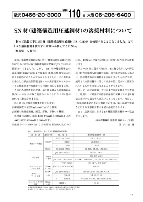 藤沢0466―20―3000溶接110番大阪06―206―6400SN材(建築構造用圧延鋼材)の溶接材料について初めて鉄骨工事にSN材(建築構造用圧延鋼材JISG3136)を使用することになりました。どのような溶接材料を使用すれば良いか教えてください。(群馬県A製作)従来、建築構造物にはSS材(一般構造用圧延鋼材JIS区分、490N/㎜2ではSN490B,Cの2区分の合計5種類G3101)およびSM材(溶接構造用圧延鋼材JISG3106)がに区分。使用されてきました。しかし、1981年の建築基準法の以上のSN材は従来材(SS材、SM材など)に比べ降伏改正(新耐震設計法)により従来のSS材、SM材ではこれ点(耐力の範囲)、降伏比の上限、化学成分を厳しく規定に十分対応することができなくなりました。また数年前し、溶接構造物の信頼性をより向上させたものですが、に発生した不良鉄骨問題、JISマーク表示違反やミルシー適用される溶接材料に関しては基本的に従来材に使用さト不正使用などの問題が生じ社会的関心を集めました。れているものと同様に考えることができます。このため建築鉄骨の設計、施工関係者から建築物の品従って、母材の種類、寸法および溶接条件などを考慮質向上への対応が強く要請されるようになりSN材がし、原則として建築工事標準仕様書に記載されるJIS規1994年に制定されました。格に基づいて選定すれば良いことになります。ただし、以下にSN材規格の概要を紹介します。JIS規格に規定のない材料については、施工試験や実績1)鋼材強度は400N/㎜2,490N/㎜2の2種類。などにより工事監督者の承認が必要になります。2)鋼材の種類は鋼板、鋼帯、形鋼、平鋼の4種類。表1に各溶接法におけるSN材適用溶接材料の一覧表板厚はSN400N,400B,490Bが6㎜以上100㎜以下。SNを示します。400C,490Cが16㎜以上100㎜以下。(㈱神戸製鋼所販売部技術サービス室)3)強度レベル400N/㎜2では種類をSN400A,B,Cの3及川政博表1各溶接法におけるSN材適用溶接材料溶接法適用SN材JIS規格適用神鋼溶接材料一例被覆アーク溶接SN400※JISZ3211D4301〃〃D4303D4316SN490JISZ3212D5016LBB-14,B-17ZERODE-44LB-26,LB-52,LTB-52A-52TMG-50,MG1-MG-50T,MG2-マグ溶接セルフシクアーー溶接ルドサブマアクージー溶接SN〃400490SN〃400490SN400〃490JISZ3312YGW11〃JISZ3313YFW-C50DMMX-100※※,〃YFWC-50DRJISZ3313YFW-S50DBMX-100S※※,MX-101,MX-55,MX-200※※DW-100※※,DW-110※※OW-56JISZ3183S502-HMF-38/US-36、MF-38A/US-36〃〃SS501-HMF-53/US-36502-HPFI-52ES/US-36L,PFI-53ES/USエレクトロスラグ溶接SN〃400490規格なしES-50※非低水素系溶接棒(※※ZDヒュシリ(低ーズ4301ムーD4303)は耐割れ性、低スパッタ)もSNの材観点に適用から薄板適用のみ。できます-36L11