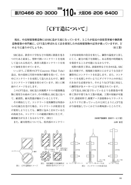 藤沢0466―20―3000溶接110番大阪06―206―6400「CFT造について」現在、中高層建築構造物にはSRC造が主流になっています。ところが最近の溶接業界紙や鋼鉄構造物建築の専門紙に、CFT造と呼ばれる工法を採用した中高層建築物の記事が載っていますが、どのように違うのでしょうか。(R工業)SRC造は、鉄骨の十字柱などの周囲に鉄筋を巻きトが冷却効果の役目を果たし、鋼管の温度が上昇しつけたあと結束し、型枠で囲いコンクリートを充填にくく、耐力の低下を抑制し、ある程度の時間耐火して造られる形式で、鉄骨と鉄筋コンクリートを用を保持することが可能になるからです。いて強度を持たせています。実際の鉄骨工事は、溶接材料などを含めS造、SRCいっぽう、ご質問のCFT(ConcreteFilledTube)造と同様です。現場組立後図3に示すような方法で造は、柱の部材に円形や四角の鋼管を用いて、その鋼管内にコンクリートを打設します。また、コンク中にコンクリートを充填して造られるもので、鋼管リートを充填しやすいようにダイヤフラムの中央にとコンクリートで強度を持たせています。図1に断穴をあける必要があり、そのようなCFT造に対応し面のイメージを示します。た鋼管柱が各メーカーにより製造されています。このCFT造は、SRC造と同規模クラスの建築構造CFT造は、SRC造で行っているような鉄筋巻や型物に使用され始めており、その特徴は、SRC造に比べ枠工事が不要であり工数の低減、工期の短縮が可能て、耐震性、耐火性能が優れていることです。です。溶接材料で、被覆アーク溶接棒からフラックスその理由として、コンクリート充填鋼管は外部か入りワイヤに替っていったのと同じように、CFT造らの圧縮力を受けた場合、コンクリートが荷重を受が今後増加していくかどうか興味深いところです。け変形しようとしても、鋼管に包みこまれているため拘束され、コンクリートの破壊が簡単に生じず、破壊耐力が大きくなるからです。(図2)また、耐火特性についても、柱内部のコンクリー(㈱神戸製鋼所技術サービス室)山本岩王コンクリート鋼材すべて内面力となる面外方向に曲げが働くCFT柱CFT柱梁梁梁梁CFT柱ポンプ車ポンプ車図1CFT造断面イメージ図2角形鋼管と円形鋼管が荷重を受けたイメージ(a)トレミー管+バケット(b)トレミー管+ポンプ圧送(c)ポンプ圧送図3コンクリートの打設方法11