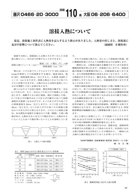 藤沢0466―20―3000溶接110番大阪06―206―6400溶接入熱について最近、溶接施工条件表に入熱量を記入するよう指示がありました。入熱量の出し方と、溶接部にB製作所)及ぼす影響について教えてください。(福岡県溶接する時に、溶接部に入る熱エネルギーのことを溶す。接入熱といい、次の式で計算することができます。それでは溶接入熱の大、小によって溶接部の性能、特溶接入熱(ジュール/cm)=電流(A)×電圧(V)×60溶接速度(cm/分)に機械的性質にどのような影響があるのか説明します。一般的には、入熱量は適正な範囲で小さいほど良好な機械的性質が得られます。具体的に言いますと、溶接金例えば、メタル系フラックス入りワイヤMX―Z1001.2属の低温での衝撃値が向上し、引張強度も高くなりまmmφを使用して下向溶接をする場合、電流300A,電す。また母材熱影響部の劣化も少なくなります。しかし圧30V,溶接速度30cm/分とすると、入熱量18,000ジ入熱量が小さすぎると、融合不良、割れなどの溶接欠陥ュール/cmとなります。溶接入熱はこのように各パスが発生しやすくなるとともに、引張強度が高くなりすぎごとに計算できますが、入熱の大小とは何を意味していることがあります。るかを理解しておく必要があります。単層の溶接金属が柱状晶の発達した粗い組織であるの図1に示すような同じ板厚、開先角度の継手を一方はに対して、多パスの溶接金属は次パスの溶接熱により、3パス仕上げ、もう一方は6パス仕上げで溶接したと仮前パスが熱処理され結晶粒が細かくなるため機械的性能定します。両継手ともに同じ電流、電圧で溶接した時、が向上します。パス数が多くなればなるほど継手全体に3パス仕上げの継手は6パス仕上げの継手に比べて溶接占める細粒化部が多くなります。速度が大変遅くなるはずです。6パス仕上げでの各パス入熱量が大きくなると、小入熱時とは逆に細粒化部のの溶接速度を40cm/分としますと、3パス仕上げでは比率が減少して溶接金属は引張強度、衝撃値とも低下す20cm/分となり、3パス仕上げでの各パスの溶接入熱る傾向となります。また過大な入熱で溶接すると、母材は6パス仕上げの2倍となります。このように溶接入熱熱影響部が組織粗大化して衝撃値が悪くなることもありは、ある開先を溶接する場合のパス数(層数)と深い関ます。係があり、入熱が大きいほどパス数が少なく、入熱が小さ表1と図2に実例として、マグ溶接ソリッドワイヤいということはパス数が多いということを意味していまMG―55およびYGW―11従来ワイヤによる入熱量を変化させた時の積層数と機械的性能を示します。どの程度の入熱で溶接するかは、溶接方法、溶接材料や要求される性能によって決められます。冶金的には小入熱で溶接する方が好ましいとの理由から、一般的には入熱の上限が規定されていることが多いようです。(㈱神戸製鋼所溶接事業部販売部技術サービス室)蛸谷正敏パス間温度:350℃MG-55YGW11従来ワイヤ15010050020472530354045505560入熱(kJ/cm)200吸収エネルギー(J)at0℃パス間温度:350℃MG-55引張強さYGW11引張強さ490MG-550.2%耐力YGW110.2%耐力600550500450400350応力(N/mm2)202530354045505560入熱(kJ/cm)図2機械的性能に及ぼす入熱の影響11入熱大入熱小図1入熱とパス数の関係表1板厚25㎜における入熱を変えたテスト条件例入熱パス間温度(kJ/㎝)(℃)電流・電圧・溶接速度積層数25354555350350A-36V-30㎝/min7層8パス430A-41V-30㎝/min6層6パス450A-42V-25㎝/min5層5パス450A-41V-20㎝/min4層4パス鋼形試先板供開状供試ワイヤワ径シールドガスイヤ25㎜t×135㎜w×400㎜LGAP7㎜:SN490B:35°レ開先:MG-55,YGW11従来ワイヤ:1.4mmφ:CO2100%25l/min35°25mm7mm