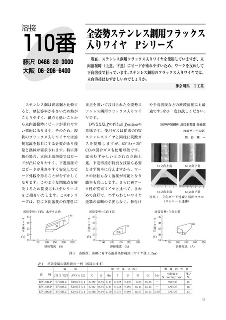 溶接110番藤沢0466―20―3000大阪06―206―6400全姿勢ステンレス鋼用フラックス入りワイヤPシリーズ現在、ステンレス鋼用フラックス入りワイヤを使用していますが、立向溶接時(上進、下進)にビードが垂れやすいため、ワークを反転して下向溶接で行っています。ステンレス鋼用のフラックス入りワイヤでは、立向溶接はむずかしいのでしょうか。神奈川県T工業ステンレス鋼は炭素鋼と比較す重点を置いて設計された全姿勢スや千鳥溶接などの断続溶接にも最ると、熱伝導率が小さいため熱がテンレス鋼用フラックス入りワイ適です。ぜひ一度お試しください。こもりやすく、融点も低いことかヤです。ら立向溶接時にビードが垂れやすDWXXXLPのPはallPositionのい傾向にあります。そのため、現意味です。使用ガスは従来のDW状のフラックス入りワイヤでは溶ステンレスワイヤと同様に炭酸ガ接電流を低目にする必要があり技スを使用しますが、80%Ar+20%量と熟練が要求されます。特に薄CO2の混合ガスも使用可能です。板の場合、立向上進溶接ではビー従来むずかしいとされた立向上ドが凸になりやすく、下進溶接で進、下進溶接が特別な技量も必要はビードが垂れやすく安定したビとせず簡単に行えますから、ワーード外観を得ることがむずかしくクの反転もなく溶接が可能となりなります。このような問題点を解能率も向上します。さらに再アー決するため開発されたPシリーズク性が従来ワイヤと比べて、きわをご紹介いたします。このPシリめて良好で、わずらわしいワイヤーズは、特に立向溶接の作業性に先端の切断の必要もなく、仮付け(㈱神戸製鋼所溶接事業部販売部技術サービス室)熊谷英一6t立向上進6t立向下進6t立向上進6t立向下進写真1立向ビード外観と断面マクロ(ストレート運棒)溶接姿勢=下向、水平すみ肉溶接姿勢=立向下進溶接姿勢=立向上進35302520156t3t50100150200250溶接電流(A)アーク電圧(V)35302520156t2-3t50100150200250溶接電流(A)アーク電圧(V)35302520156t3t2t50100150200250溶接電流(A)アーク電圧(V)図1各板厚、姿勢に対する溶接条件範囲(ワイヤ径1.2㎜)表1溶着金属の諸性能の一例(溶接のまま)規格化学成分(%)銘柄JISZ3323AWSA5.22CSiMnPSNiCrMoDW-08LPYF308LCE308LT-.40.0270.551.510.0220.0109.8919.45DW-09LPYF309LCE309LT-.40.0270.561.210.0230.00912.4523.55――DW-16LPYF316LCE316LT-.40.0280.601.500.0210.00812.6518.352.68機械的性質引張強さ伸びN/㎜2{kgf/㎜2}%550{56}570{58}570{58}45384311