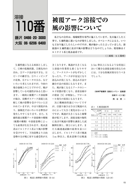 溶接110番藤沢0466―20―3000大阪06―6206―6400被覆アーク溶接での風の影響について私どもの会社は、現場配管を専門に施工しています。先日施工した工事で、X線性能に悪いものが発生しました。オペレータによると、いつもどおり施工したらしいのですが、風が強かったと言っていました。溶接部のX線性能に及ぼす風の影響はどうなのでしょうか。使用棒はイルミナイト系と低水素系です。(三重県S工業所)X線性能に与える原因としましきくなります。風速が大きくなる2.5m/秒以上になるような状況にて、①棒の乾燥状態、②開先内のと溶接の作業性も悪くなりやすおいて健全な溶接金属を得るため汚れ、③アーク長が長すぎる、④く、アークスタートがむずかしくには、十分な防風対策を行うべきビードの継ぎ方、⑤ウィッピングなったり、アークが不安定になりでしょう。の有無、⑥クレータの大小、など溶込みが浅くなり、溶込み不良やいろいろ考えられますが、今回の融合不良の原因にもなります。ま場合強風とのことですので、風がた、風が強くなるとアークのシー影響している可能性があると思いルド状態が悪くなり、溶着金属中(㈱神戸製鋼所溶接カンパニー営業部ます。一般的に被覆アーク溶接棒の窒素[N]が増加し、ブローホの場合、炭酸ガスアーク溶接と比ール発生の原因にもなります。較して風の影響を受けづらいと言次に機械的性能についてです技術サービス室)熊谷英一われていますが、やはり限度があが、引張り強さはさほど風速の大表1X線透過結果り、強風化ではいろいろな弊害が小によって大きく変化はないよう発生しやすくなります。また、Xですが、風速が大きくなると衝撃線性能は被覆アーク溶接棒の種類値が低下します。溶接金属の靱性(被覆の種類)や溶接姿勢によっに及ぼす風速の影響を調査した試ても結果が左右されます。低水素験例を図1,図2に示します。ま系はイルミナイト系より風の影響たX線透過試験の結果を表1に供試棒B―14LB―26姿勢風速(m/秒)下向立向下向立向02.55.010.0○○○○○○○×○○△×○○××を受けやすく、下向姿勢より立向示します。イルミナイト系で風速姿勢の方が風に対する感受性が大5m/秒以上、低水素棒では風速○:良好△:ブローホール発生×:ブローホール多発図1風速と衝撃値の関係(B―14)図2風速と衝撃値の関係(LB―26)15