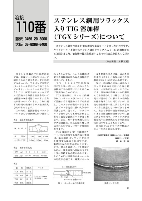 溶接110番藤沢0466―20―3000大阪06―6206―6400ステンレス鋼用フラックス入りTIG溶加棒(TGXシリーズ)についてステンレス鋼管の溶接をTIG溶接で裏波ビードを出したいのですが、バックシールド不要のステンレス鋼用フラックス入りTIG溶加棒があると聞きました。溶加棒の特長と使用する上での注意点を教えてください。(神奈川県A鉄工所)ステンレス鋼のTIG裏波溶接では、裏波ビードが大気によって酸化されると健全なビードが形成できないため、アルゴンガス等でバックシールドを行って施工されています。バックシールドの方法としては、配管全体をシールドガスで置換する方法と治具を用いて溶接部のみを局部シールドする方法が用いられています。これに要する時間や使用するガス量は莫大なものとなります。このため、裏波溶接をバックシールドなしで経済的にかつ容易に表1適正な開先条件開先形状板厚(t)4㎜6㎜10㎜ルートギャップ(G)2.0㎜2.5㎜3.0㎜表2標準溶接電流板厚(㎜)3〜56〜910電流(Amp)80〜9090〜10590〜110表3銘柄棒端色サイズTGX‐308LTGX‐316LTGX‐347赤緑青色色色TGX‐309L黄緑色2.2φ×1,000l㎜(包装単位:5㎏)ールを形成させるには、適正な開先条件(表1)と板厚に応じた溶接電流(表2)の設定が必要です。次に、溶加棒の送りは通常のソリッドTIG棒を使用する時と異なり、小刻みに早いピッチで行います。溶加棒を溶融プールに突込んで十分溶かしては離し、また突込んで溶かしては離すという操作を繰り返すことは同じですが、突込む溶加棒を一度に多くしすぎないように注意しなければなりません。あまり多量の溶加棒を突込みすぎると溶加棒が溶融できずに裏に突きぬけたり、フラックスが溶接金属中に溶け残るなどの溶接欠陥が発生することもあります。最後にTGXシリーズの製造メニューを表3に示します。(㈱神戸製鋼所溶接カンパニー営業部技術サービス室)蛸谷正敏行うことができ、しかも品質的に健全な溶接部の得られる溶接法が望まれていました。フラックス入りTIG溶加棒(TGXシリーズ)は、このような溶接施工者の要望にこたえるために開発されたものです。TGX溶加棒は、ワイヤに内臓されたフラックスがアークによって溶融すると適量のスラグを生成し、このスラグが表ビードとともに裏ビードを完全に覆い大気から保護します。従って、バックシールドを行わなくても酸化されることなく良好な裏波ビードが選られます。また、ビードを被覆したスラグは溶接後、容易にはく離し除去されるので美しいビード外観となります。TGX溶加棒を用いて鋼管のルートパスを溶接する時の施工要領は、基本的にはソリッドTIG棒を使用する場合と同様ですが、TGX特有の注意点があります。まず、健全な裏波ビードを確保するには、開先裏側へ溶融スラグを十分に供給する必要があります。そのためには溶接中のキーホールの形成が必須です。確実にキーホ図1キーホールの形成状況裏波ビード外観11