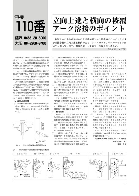 溶接110番藤沢0466―20―3000大阪06―6206―6400立向上進と横向の被覆アーク溶接のポイント板厚9㎜の突合せ溶接を低水素系被覆アーク溶接棒で行っておりますが溶接姿勢が立向上進と横向であり、アンダカット、オーバーラップが発生し困っています。溶接のポイントについて教えてください。(北海道A工事)溶接はあくまでも下向姿勢で行うのが②1層目は充分な溶け込みを得るようほど残るように溶接する。基本です。これは溶接者の体の姿勢に無に図1に示す溶接棒保持角度で、アー④2層目の2パスは開先内でアークを理がなく、また溶融金属は重力にしたがク長を短く保ちながら開先両端のルー発生しウィービングで前ビードの上側い低い方に流れますので比較的安定したト部を十分溶かしながらウィービング開先面のきわを溶かしながら、ビード溶接作業が行えるからです。を行う。なお、溶接棒の保持角度は初層高さを母材表面より開先面が1㎜ほどしかし、実際の構造物の製作、組立てから仕上げ層の各パスとも同じに保つ。残るように溶接する。においては半転、ポジショニングが困難③2層目は開先内でアークを発生、1⑤3層目(仕上げ層、3パス仕上げ)のでどうしても立向、横向きで溶接をしな層目ビードの両端を溶かしながらウィ1パスは母材のアンダカット、オーバければならない部分が出てきます。ービングを行い、ビ-ド高さが母材表ラップを防止するために溶接電流を以下に低水素系被覆アーク溶接の溶接面より2㎜くらい残るように溶接を行う。130〜140Aに調整し、開先内でアー上の注意事項および欠陥が発生した場合④3層目(仕上げ層)はアンダカット防クを発生しセミウィービングかウィーの補修のポイントについて説明します。止のためにも溶接電流を125〜135Aビングで下側開先を1㎜ほど溶込まなお、下向溶接でも同様ですが所定の温に下げて開先内よりアークを出して開せ、余盛り高さを2〜3㎜ぐらいにな度と時間にて再乾燥を必ず行うとともに先の両端を停止しながらウィービングるように仕上げる。アークスタートはバックステップ法(後を行い仕上げる。また、オーバーラップが発生した場もどり法)を採用します。1.立向上進溶接①本溶接を行う前に溶接電流の設定をまた、3層目でアンダカットができ合にはオーバラップしたビードをグラた場合には棒径3.2φを使用して100〜インダなどで完全に除去する。115Aでアンダカットを十分溶かし込⑥3層目の2パスは溶接電流を150A行う。捨金上でアークを出し電流計をんで補修を行う(棒径4.0φでの補修に調整し、開先内でアークを発生させ使用し棒径4.0φで130〜140Aに調整溶接条件は3層目の条件で行う。)ウィービングで1パス目と同じビードする。2.横向溶接高さに合うように溶接する。①捨金上でアークを出し電流計を使用⑦3層目の3パスはアンダカット防止し棒径4.0φで160Aに調整する。(溶のために、溶接電流を120〜130Aに接棒保持角度および積層は表1参照)調整し開先内でアークを発生させスト②1層目は十分な溶け込みを得るようレートでビード上側にアンダカットがにアーク長を短く保ちながら開先両端発生しやすいので十分にアーク長を短のルート部を十分溶かしながらウィーく保って溶接を行う。ビングを行い溶接する。また、アンダカットが発生した場合③2層目(2パス仕上げ)の1パスは開には棒径3.2φを使用して110〜120A先内でアークを発生し、セミウィービで補修溶接を行う。ングかウィービングで前ビードの下側(㈱神戸製鋼所溶接カンパニー販売部開先面のきわを溶かしながら、ビード高さを下側母材表面より開先面が1㎜技術サービス室)及川政博表1横向溶接の溶接棒保持角度と積層1層(1パス)2層(2パス)2層(3パス)3層(4パス)3層(5パス)3層(6パス)11