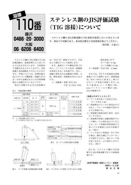 溶接110番藤沢――6203大阪―06620460―66000400ステンレス鋼のJIS評価試験(TIG溶接)についてステンレス鋼のJIS評価試験のTIG溶接を取得したいと考えています。初めての受験であり、基本的な種目と実技要領を教えてください。(香川県A鉄工)ステンレス鋼のTIG溶接でのJISは、TN-Fが一般的ですので、今回評価試験は、溶接姿勢により表1のはこの種目について説明します。ように区分されています。今回初めまず、裏波ビードの酸化を防ぐた開先形状70°Vルート面=0.5㎜ルート間隔=0.5㎜て受験されるとのことなので、学科めに、バックシールド治具(試験板2)溶加棒:TGS―3082.0㎜φ試験と実技試験をうけることになりを拘束できる)が必要です。次に、ます。学科については、産報出版の試験に使用される試験板の材質、寸それでは、TN―Fの具体的な溶接JISステンレス鋼溶接(受験の手引法、開先形状、溶加棒は次のとおり要領について説明します。溶接電流き)の中に記載されている学科問題です。は、90A〜100Aに設定し、図1に集から出題されているようです。1)試験板:材質SUS―304示すトーチ角度で溶接します。Ar初めて受験される方の実技種目寸法3t―125w―150Lガス流量は、トーチ側10〜12L/表1実技試験の種類試験の種類溶接方法溶接姿勢記号下立横上向1)SUSTN―F向向向SUSTN―VSUSTN―HSUSTN―Oティグ溶接継手の種類試験材寸法裏当て金の有無2)試験材形状板板厚3㎜N水平固定鉛直固定SUSTN―P管呼び径80―100A,肉厚3㎜注1)実技試験の基本とする。2)Nは裏当て金なしを、Aは裏当て金ありを示す。min,バックシールド側10〜20L/minが最適です。試験の名称(溶接上のポイントとして)ティグ下向試験ティグ立向試験ティグ横向試験ティグ上向試験ティグ固定管試験1)アーク長を短くし安定させる。(アーク長さ1㎜)2)溶加棒はクレータに突込むのではなく、クレータの裏面で溶かすように供給する。3)溶加棒の供給は同じ量を一定のピッチで行う。4)溶加棒を供給し溶融金属がクレータ端ルートに流れ込んでいることと、ビード表面が母材表面より高いことを確認しながら前進する。(図2)5)トーチねらい角度90゜がくずれた場合、倒れた側にアンダーカットが発生しやすい。特にアーク長が長くなると、より発生しやすくなる。(図3)以上が、ステンレス鋼のTIG溶接でのJIS評価試験TN―Fの溶接要領です。(㈱神戸製鋼所溶接カンパニー営業部技術サービス室)蛸谷正敏11