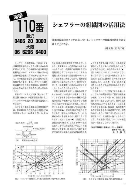 溶接110番藤沢――6203大阪―06620460―66000400シェフラーの組織図は、主にステンレス鋼溶接金属のフェライト量を求める時に用いますが、この組織図の成分範囲が比較的広いので、ステンレス鋼のほか炭素鋼や低合金鋼、高Mn鋼などについても、その組織を推定するのに活用できる特徴があります。また、ステンレス鋼と炭素鋼などとの異材溶接時に、溶接性をあらかじめ評価してみることにも使われます。それでは、ステンレス鋼(SUS304)と炭素鋼(SS400)の異材溶接を例にし、シェフラーの組織図の活用法を説明していきます。ステンレス鋼と炭素鋼との異材溶接では、炭素鋼側からの溶込みを考慮して通常溶接材料は、308系よりNi,Cr量のシェフラーの組織図の活用法神鋼溶接総合カタログに載っている、シェフラーの組織図の活用方法を教えてください。(埼玉県K鉄工所)多い309系の溶接材料を使用します。しかし、炭素鋼母材への溶込みをコントロールしないと、溶接時に高温割れなどの問題が生じることがあります。これらの問題は異材溶接部の溶接金属中のフェライト量と密接に関係しており、異材溶接における注意点はフェライト量のコントロール(炭素鋼側への溶込みのコントロール)ということになります。実際に組織図を使用し、溶込み率をどれくらいにすれば良いか推測してみます。まず溶接するそれぞれの鋼材の化学成分を図2の横軸のCr当量および縦軸のNi当量の計算式にて算出し、図にプロットします。溶接に際してSS400(▲)とSUS304(▲)が同じ割合で溶込んだとすると、両母材の中間点(a点、×)の組成の母材を溶接するのと同じことになります。従ってD309(▲)で溶接された溶接金属の組成は、a点とD309の線上にあり、その位置は溶込み率によって変化していきます。図3に示しております安全域の中に組成を入れなければならないことを考慮すれば(少なくとも溶接金属のフェライト量が0%にならないようにするためには)、溶込み率がd点(,図2の例では33%)により小さくしなければならないことが読み取れます。また、SUS304と高Mn鋼(▲)との異材溶接の場合(a’点×,d’点)では、溶込み率はさらに小さくする必要のあることが分かります。このようにして、実施工に入る前にシェフラーの組織図を用いて異材溶接金属の組成(フェライト量)や、溶接性を推測する時に活用しています。図から読み取れた溶込み率をd点あるいはd'点より小さくするには、低電流・低速度側の条件で溶接することは必須ですが、実際の施工にあたってはテストピースにより確認すれば、より確実な施工になるでしょう。異材溶接の時は、シェフラー組織図を一度活用してみてください。(㈱神戸製鋼所溶接カンパニー営業部技術サービス室)金子和之11