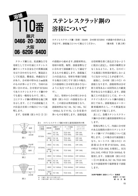 溶接110番藤沢――6203大阪―06620460―66000400ステンレスクラッド鋼の溶接についてステンレスクラッド鋼(母材:SS400合せ材SUS304)の溶接の仕事が入る予定です。溶接施工について教えてください。(栃木県Y鉄工所)クラッド鋼とは、炭素鋼などをの溶接から始めます。溶接材料は、は母材側を深く溶込まさないよう母材としてその片面にステンレス母材の材質、板厚、溶接姿勢などに低目に設定し、母材の稀釈を少鋼やニッケル合金などの異種金属に合わせて溶接継手として満足でなくなるように、また、④のビーをはり合わせたもので、製造法ときるものを選定します。溶接施工ド止端部に母材部が露出しないよして圧延法、爆着法、肉盛法など上の注意点は、母材を単独で溶接うに気をつけることが必要です。があり、合せ材の厚みは3㎜前後する場合と同じです(図2の場合、最後に、合せ材(図1の⑤)ののものが多いようです。今回のお①の溶接時に合せ材を溶かさない溶接となります。溶接材料は合せ問い合わせは、合せ材がSUS304ように気をつけることが必要で材と同等あるいは同等以上の耐食でありステンレスクラッド鋼の中す)。性があるものを選定します。溶接でも最も一般的なもので、図1、次に、母材から合せ材にかかる施工上の注意点としては、オース2にクラッド鋼の標準的な施工例境界(図1の④)の溶接を行いまテナイト系ステンレス鋼の溶接とを示します。ここでは溶接施工上す。この部分は異材溶接となり、同じであり、溶接電流はメーカーの注意点を図1の場合について説溶接材料はNC―39,NC―39L,NC推奨範囲内とし、パス間温度は明します。―39MoLなどのNi,Cr含有量の150℃以下で施工します。まず、母材側(図1の①②③)多いものを使用します。溶接電流表1に、各種ステンレスクラッ表1ステンレスクラッド鋼合せ材と適用溶接材料の例します。ド鋼の合せ材と適用溶接材料を示合せ材の種類溶接層被覆アークティグ溶接溶接棒ワイヤフラックス入りワイヤ図1SUS3041層目NC―39NC―39L2層目以降NC―38NC―38LTGS―309TGS―309LTGS―308TGS―308LDW―309DW―309LDW―308DW―308L1層目NC―39LTGS―309LDW―309LSUS304L2層目以降NC―38LTGS―308LDW―308L図2SUS3161層目NC―39MoLTGS―309MoLDW―309MoL2層目以降NC―36NC―36LTGS―316TGS―316LDW―316DW―316L特殊な例として、内面に合せ材のある比較的小径のステンレスクラッド鋼パイプの溶接について説明します。この場合は片面溶接となり、ルートパス(図3の①)の溶接は合せ材がSUS304,304Lの時はTGS―309Lを使用し、SUS316,316Lの時はTGS―309MoLを使用します。次層以降(図3の②〜⑤)の溶接は、NC―39,TGS―309などの溶接材料で最終層まで溶接1層目NC―39MoLTGS―309MoLDW―309MoLします。SUS316L2層目以降NC―36LTGS―316LDW―316L(㈱神戸製鋼所溶接カンパニー営業部図3※※1層目:図1の④と図2の②2層目以降:図1の⑤と図2の③技術サービス室)蛸谷正敏15