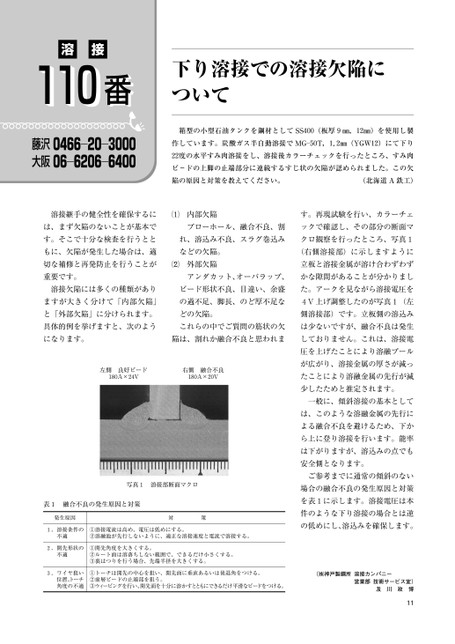 溶接11111111110000000000番番番番番番11111111下り溶接での溶接欠陥について藤沢0466―20―3000大阪06―6206―6400箱型の小型石油タンクを鋼材としてSS400(板厚9㎜,12㎜)を使用し製作しています。炭酸ガス半自動溶接でMG―50T,1.2㎜(YGW12)にて下り22度の水平すみ肉溶接をし、溶接後カラーチェックを行ったところ、すみ肉ビ-ドの上脚の止端部分に連続するすじ状の欠陥が認められました。この欠陥の原因と対策を教えてください。(北海道A鉄工)溶接継手の健全性を確保するに内部欠陥す。再現試験を行い、カラーチェは、まず欠陥のないことが基本でブローホール、融合不良、割ックで確認し、その部分の断面マす。そこで十分な検査を行うととれ、溶込み不良、スラグ巻込みクロ観察を行ったところ、写真1もに、欠陥が発生した場合は、適などの欠陥。切な補修と再発防止を行うことが外部欠陥(右側溶接部)に示しますように立板と溶接金属が溶け合わずわず重要です。アンダカット、オーバラップ、かな隙間があることが分かりまし溶接欠陥には多くの種類がありビード形状不良、目違い、余盛た。アークを見ながら溶接電圧をますが大きく分けて「内部欠陥」の過不足、脚長、のど厚不足な4V上げ調整したのが写真1(左と「外部欠陥」に分けられます。どの欠陥。側溶接部)です。立板側の溶込み具体的例を挙げますと、次のようこれらの中でご質問の筋状の欠は少ないですが、融合不良は発生になります。陥は、割れか融合不良と思われましておりません。これは、溶接電左側良好ビード180A×24V右側融合不良180A×20V写真1溶接部断面マクロ表1融合不良の発生原因と対策発生原因対策1.溶接条件の不適①溶接電流は高め、電圧は低めにする。②溶融池が先行しないように、適正な溶接速度と電流で溶接する。2.開先形状の不適①開先角度を大きくする。②ルート面は溶落ちしない範囲で、できるだけ小さくする。③裏はつりを行う場合、先端半径を大きくする。3.ワイヤ狙い位置、トーチ角度の不適①トーチは開先の中心を狙い、開先面に垂直あるいは後退角をつける。②前層ビードの止端部を狙う。③ウィービングを行い、開先面を十分に溶かすとともにできるだけ平滑なビードをつける。圧を上げたことにより溶融プールが広がり、溶接金属の厚さが減ったことにより溶融金属の先行が減少したためと推定されます。一般に、傾斜溶接の基本としては、このような溶融金属の先行による融合不良を避けるため、下から上に登り溶接を行います。能率は下がりますが、溶込みの点でも安全側となります。ご参考までに通常の傾斜のない場合の融合不良の発生原因と対策を表1に示します。溶接電圧は本件のような下り溶接の場合とは逆の低めにし、溶込みを確保します。(㈱神戸製鋼所溶接カンパニー営業部技術サービス室)及川政博11