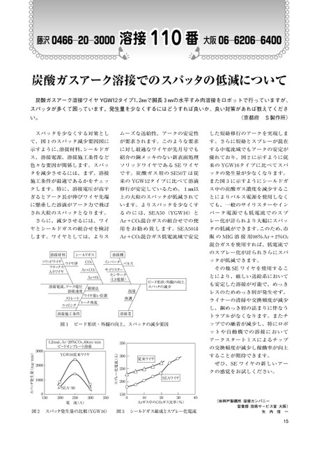 藤沢0466―20―3000溶接110番溶接番大阪06―6206―6400炭酸ガスアーク溶接でのスパッタの低減について炭酸ガスアーク溶接ワイヤYGW12タイプ1.2㎜で脚長3㎜の水平すみ肉溶接をロボットで行っていますが、スパッタが多くて困っています。発生量を少なくするにはどうすれば良いか、良い対策があれば教えてください。(京都府S製作所)スパッタを少なくする対策としムーズな送給性、アークの安定性した短絡移行のアークを実現しまて、図1のスパッタ減少要因図にが要求されます。このような要求す。さらに短絡とスプレーが混在示すように、溶接材料、シールドガに対し最適なワイヤが先月号でもする中電流域でもアークの安定がス、溶接電源、溶接施工条件など紹介の銅メッキのない新表面処理優れており、図2に示すように従色々な要因が関係します。スパッソリッドワイヤであるSEワイヤ来のYGW16タイプに比べてスパタを減少させるには、まず、溶接です。炭酸ガス用のSE50Tは従ッタの発生量が少なくなります。施工条件が最適であるかをチェッ来のYGW12タイプに比べて溶滴また図3に示すようにシールドガクします。特に、溶接電圧が高す移行が安定しているため、1㎜以ス中の炭酸ガス濃度を減少するこぎるとアーク長が伸びワイヤ先端上の大粒のスパッタが低減されてとによりパルス電源を使用しなくに懸垂した溶滴がアーク力で飛ばいます。よりスパッタを少なくすても、一般のサイリスターやインされ大粒のスパッタとなります。るのには、SEA50(YGW16)とバータ電源でも低電流でのスプさらに、減少させるには、ワイAr+CO2混合ガスの組合せでの使レー化が計られより大幅にスパッヤとシールドガスの組合せを検討用をお勧め致します。SEA50はタの低減ができます。このため、市します。ワイヤとしては、よりスAr+CO2混合ガス低電流域で安定販のMIG溶接用98%Ar+2%O2混合ガスを使用すれば、低電流でのスプレー化が計られさらにスパッタが低減できます。その他SEワイヤを使用することにより、厳しい送給系においても安定した溶接が可能で、めっきレスのためめっき屑が発生せず、ライナーの清掃や交換頻度が減少し、銅めっき屑の詰まりに伴なうトラブルがなくなります。またチップでの融着が減少し、特にロボットや自動機での溶接においてアークスタートミスによるチップの交換頻度が減少し稼働率が向上することが期待できます。ぜひ、SEワイヤの新しいアークの感覚をお試しください。(㈱神戸製鋼所溶接カンパニー営業部技術サービス室大阪)矢内信一15溶接材料シールドガス溶接機ソリッドワイヤワイヤ径フラックス入りワイヤCO2インバータパルスAr+CO2サイリスターAr+O2センサーク(LS電源)溶接電流、アーク電圧溶接速度積層法ワイヤ狙い位置ストレートウィビングトーチ角度技量体調ビード形状・外観の向上スパッタの減少溶接施工条件溶接者図1ビード形状・外観の向上、スパッタの減少要因従来ワイヤSEAワイヤ10203040Arガス中のCO2ガス比率(%)350300250200スプレー化電流(A)15001.2mmφ、Ar―20%CO2、40cm/minビードオンプレート溶接YGW16従来ワイヤSEA―50200250300350電流(A)3000200010000150スパッタ発生量(mg/min)図2スパッタ発生量の比較(YGW16)図3シールドガス組成とスプレー化電流