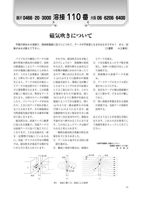 藤沢0466―20―3000溶接110番溶接番大阪06―6206―6400磁気吹きについて平板の突合わせ溶接で、母材終端部に近づくにつれて、アークが不安定になるのはなぜですか?また、対策があれば教えて下さい。(三重県H工業所)パイプなどの細長いワークの溶それでは、磁気吹きはなぜ起こらアースを取る。接や厚板の開先内の溶接で、母材るのでしょうか?溶接物の形状③十分な幅をもったタブ板を使の終端部にくるとアークの吹き付や大きさ、材質や押さえ治具など用し、母材への取付けはしっかけが不規則に動き回ることがありの影響が複雑にかかわりあってくり溶接する。ます。このような現象を「磁気吹るので一概には言えませんが、図④溶接物から直接アースを取き」と呼んでいます。磁気吹きが1(a)に示すように磁界中の導体る。生じると、アークの向きが変わっに電流を流すと、導体に力が働く⑤アースケーブルをコイル状にてアークの安定性やビード形状なことはフレミングの左手の法則と巻かないようにする。どに悪影響を与えます。この状態してよく知られています。このと⑥余分なケーブル類は溶接線のが激しい場合には、異常なアークき導体のまわりの磁界は、図1近くに置かず、できるだけ離し音となり、大粒のスパッタが飛散(b)に示すように導体中を流れるておく。したり、パンパンとアークがはね電流によってできる磁界と、図1⑦短い溶接が多数含まれる部材たり、ときにはアーク切れが起こ(a)のような一様な磁界との合成の溶接では、交流アーク溶接をることもあります。その溶接部はで図1(c)のようになります。磁活用する。当然溶接欠陥が発生する確率が極力線密度の大きい部分が小さい部めて高くなります。分の方へ力を及ぼすので、導体は以上のようなことが有効な手段に磁気吹きは、直流アークに顕著手前の方へ押されることになりまなります。これらの点を参考にしに見られる現象で、交流アークです。この力によってアークは曲げて溶接作業をチェックしてみてくは直流アークに比べて起こりにくられると考えられます。ださい。くなります。これは交流が正・逆一般的な磁気吹き現象の防止対を一定期間で反転しているため策を以下にまとめました。に、交流一サイクルの半分の期間①アースから遠ざかる方向に溶では、磁気吹きが成長する暇がな接を進める。いからだと考えられています。②細長い母材の場合は、両端か(㈱神戸製鋼所溶接カンパニー営業部技術サービス室)金子和之磁力線SN力電流電流磁力線電流磁力線力(a)(b)(c)図1電流に働く力、電流による磁界11