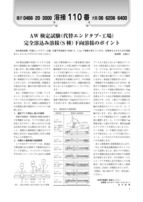 藤沢0466―20―3000溶接110番溶接番大阪06―6206―6400AW検定試験(代替エンドタブ・工場)完全溶込み溶接(S種)下向溶接のポイントAW検定試験(代替エンドタブ・工場)S種下向溶接をYGW―11、1.2φで受験を考えています。合格率を上げるための溶接ポイントについてアドバイスをください。(高知県B鉄工)AW検定試験の代替エンドタブは従(32t)と開先側のルート部を確実に溶かアークより先行しないよう確実にアーク来の工場溶接と比べ試験板サイズが大きし込みます。この時、固形タブの端部に溶でルート部を溶かし込むことが大切です。く違います。特に両端に固形エンドタブ融金属が十分入り込んでから、ルートギ2,3パスは、前パスのクレータ部よをセットするため、溶接スタート部のねャップと同じ幅でウィービングを行い、りアークスタートし、固形タブ端部よりらい位置がむずかしく、さらに溶接始端ルート部を確実に溶かし溶接を行います。前ビード幅と同じ幅でウィービング操作部・終端部でワイヤの突出し長さが変化開先後半から終端にかけて、やや前進しながら、後退法で溶接を行います。しやすくなり、その結果初層、両端部で法の形で溶接を行うので、溶融金属が先終端部でやや前進法になりますが、固の溶込み不良、融合不良の発生が多く見行しないような速度でウィービングをし形タブの端部まで溶かし、クレータ処理受けられます。ます。を行い、クレータ電流で開先内10〜15㎜また、中間層でのビード不整・アンダ終端部は固形タブの端部まで溶かし、位までもどりアークを切ります。4パスカット、仕上層でのアンダカット・オークレータ処理を行い、そのままクレータ以降もスタートおよび終端部の溶接要領バラップなどの欠陥が生じやすい傾向に電流で開先内10〜15㎜位までもどりアーは同じです。ただ、1層2パス溶接となりますので、4パス、5パスは前ビード幅の程度のセミウィービング、6,7パスは前ビードの程度のウィービング幅で行います。また、盛上げる量は4パス、5パスで板表面より2〜3㎜低い程度に調整します。6,7パスで脚長7㎜程度を狙って盛上げますが、板厚32㎜側にアンダカットが発生しないように、トーチ角度、トーチ操作に注意します。スラグ除去は4,6,7パスの前に行い、1〜2,4パスのスラグをそのまま次のパスを溶接します。表1に溶接条件、溶接要領を示します。以上AW検定試験溶接のポイントについて説明しました。特にワイヤ突出し長さの変動は溶込み深さが変わり欠陥発生の原因となります。その対策の一つとして、ワイヤ突出し長さが変わっても電流が一定になる制御を行う新しい電源(CS350,CS500)が開発されています。“百聞は一見に如かず”ぜひ一度お試しください。(㈱神戸製鋼所溶接カンパニー営業部カスタマーサポートセンター)及川政博7あります。そこで、初層から最終層までクを切ります。特に初層は溶接金属がの欠陥防止策の溶接ポイントについて説明します。表1溶接条件と溶接要領1.適正ワイヤ突出し長さの保持溶接条件積層法と溶接要領○印はクレーター処理S(5≦S≦10)5635°74312632t19t32t32t19t32t19t32t19t32t19t32t3mm残す初層の始端部・終端部の溶接は固形タブが邪魔するため、ワイヤの突出し長さが長くなりやすく、図1に示すように溶込み深さが浅くなる傾向にあります。従って、初層から最終層まで適正なワイヤ突出し長さ15〜30㎜を保持しながら溶接することが重要です。2.初層から最終層の溶接要領1パス目のアークスタートは、後退法で開先側(19t)の固形タブ端部付近からアークを発生し、バックステップは行わずすばやくウィービングしながら立板側適正長15〜30mm20ねらい適正電流溶込み減浅短増深図1溶込み形状に及ぼす突出し長さの影響1パス280A×32V0〜190A×クレータ溶接条件1823〜24V(1〜7パス同じ)2パス820A×32V3パス280A×32V4パス280A×32V5パス260〜32V30〜280A×6パス260A×30V7パス260A×30V