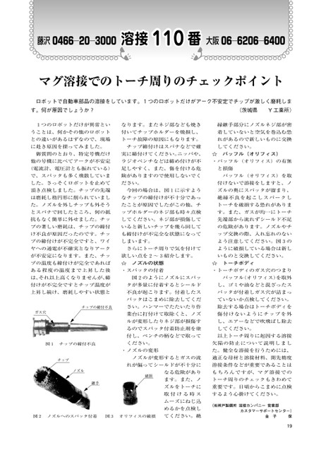 藤沢0466―20―3000溶接110番溶接番大阪06―6206―6400マグ溶接でのトーチ周りのチェックポイントロボットで自動車部品の溶接をしています。1つのロボットだけがアーク不安定でチップが激しく磨耗します。何が原因でしょうか?(茨城県Y工業所)1つのロボットだけが異常といなります。またネジ部なども焼き縁継手部分にノズルネジ部が密うことは、何かその他のロボット付いてチップホルダーを焼損し、着していないと空気を巻込む恐との違いがあるはずなので、現場トーチ故障の原因にもなります。れがあるので新しいものに交換に赴き原因を探ってみました。チップ締付けはスパナなどで確してください。御質問のとおり、特定号機だけ実に締付けてください。ニッパや、☆バッフル(オリフィス)他の号機に比べてアークが不安定ラジオペンチなどは締め付けが不・バッフル(オリフィス)の有無(電流計、電圧計とも振れている)足しやすく、また、傷を付ける危と損傷で、スパッタも多く飛散していま険がありますので使用しないでくバッフル(オリフィス)を取した。さっそくロボットを止めてださい。付けないで溶接をしますと、ノ頂き点検しました。チップの先端今回の場合は、図1に示すようズルの奥にスパッタが溜まり、は磨耗し楕円形に削られていましなチップの締付けが不十分であっ絶縁不良を起こしスパークした。ノズルを外しチップも外そうたことが原因でしたがこの他、チトーチを破損する恐れがありまとスパナで回したところ、何の抵ップホルダーのネジ部も時々点検す。また、ガスが均一にトーチ抗もなく簡単に外せました。チッしてください。ネジ部が損傷して先端部から流れずシールド不足プの著しい磨耗は、チップの締付いると新しいチップを幾ら回しての危険があります。ノズルやチけ不良が原因だったのです。チッも締付けが不完全な状態になってップ交換の際、入れ忘れのないプの締付けが不完全ですと、ワイしまいます。よう注意してください。図3のヤへの通電が不確実となりアークさらにトーチ周りで気を付けてように破損している場合は新しが不安定になります。また、チッ欲しい点を2〜3紹介します。いものと交換してください。プの温度も締付けが完全であれば☆ノズルの状態☆トーチボディある程度の温度まで上昇した後・スパッタの付着・トーチボディのガス穴のつまりは、それ以上高くなりませんが、締図2のようにノズルにスパッバッフル(オリフィス)を取外付けが不完全ですとチップ温度がタが多量に付着するとシールドし、ゴミや油などと混ざったス上昇し続け、磨耗しやすい状態と不良が起こります。付着したスパッタが付着しガス穴が詰まっチップの締付不良さい。ハンマーでたたいたり作除去する場合はトーチボディをパッタはこまめに除去してくだていないか点検してください。ガス穴図1チップの締付不良チップノズル継手業台に打付けて取除くと、ノズ傷付けないようにチップを外ルが変形したりネジ部が損傷すし、エアーなどで吹飛ばし除去るのでスパッタ付着防止剤を塗してください。付し、ペンチの柄などで取って以上トーチ周りに起因する溶接ください。・ノズルの変形欠陥の防止について説明しました。健全な溶接を行うためには、ノズルが変形するとガスの流適正な母材と溶接材料、開先精度れが偏ってシールドが不十分に溶接条件などが重要であることは破損なる危険がありもちろんですが、マグ溶接でのます。また、ノトーチ周りのチェックもきわめてズルをトーチに重要です。日頃からこまめに点検取付ける時スするよう心掛けてください。図2ノズルへのスパッタ付着図3オリフィスの破損ムーズにねじ込めるかを点検してください。絶(㈱神戸製鋼所溶接カンパニー営業部カスタマーサポートセンター)金子保19