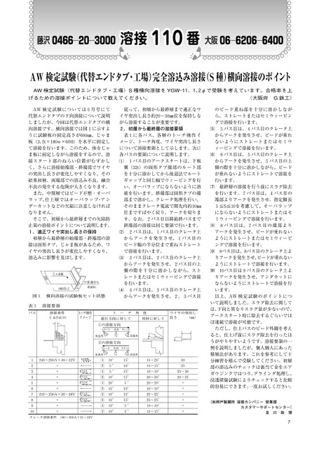 藤沢0466―20―3000溶接110番溶接番大阪06―6206―6400AW検定試験(代替エンドタブ・工場)完全溶込み溶接(S種)横向溶接のポイントAW検定試験(代替エンドタブ・工場)S種横向溶接をYGW―11、1.2φで受験を考えています。合格率を上げるための溶接ポイントについて教えてください。(大阪府G鉄工)のビード重ね部を十分に溶かしながら、ストレートまたはセミウィービングで溶接を行います。5パス目は、4パス目のクレータ上からアークを発生させ、ビードが垂れないようにストレートまたはセミウィービングで溶接を行います。6パス目は、5パス目のクレータ上からアークを発生させ、5パス目の上側の際を十分に溶かしながら、ビードが垂れないようにストレートで溶接を行います。最終層の溶接を行う前にスラグ除去を行います。7パス目は、4パス目の端部よりアークを発生させ、指定脚長5≦S≦10を考慮して、オーバラップにならないようにストレートまたはセミウィービングで溶接を行います。8パス目は、7パス目の端部よりアークを発生させ、ビードが垂れないようにストレートまたはセミウィービングで溶接を行います。19パス目は、8パス目のクレータ上よりアークを発生させ、ビードが垂れないようにストレートで溶接を行います。0パス目は9パス目のクレータ上よりアークを発生させ、アンダカットにならないようにストレートで溶接を行います。以上、AW検定試験のポイントについて説明しました。スラグ除去に関しては、下向と異なりスラグ量が少ないので、アークスタート時に除去するぐらいでほぼ連続で溶接が可能です。ただし、仕上パスのビード外観を考えると、仕上げ前にスラグ除去を行ったほうがやりやすいようです。溶接要領の一例を説明しましたが、個人個人にあった積層法があります。これを参考にして十分練習を積んで受験してください。初層部の溶込みのチェックは裏当て金をエアガウジンクではつり、グラインダ処理し、浸透探傷試験によりチェックすると比較的容易にできます。一度お試しください。(㈱神戸製鋼所溶接カンパニー営業部カスタマーサポートセンター)及川政博7AW検定試験については5月号にて代替エンドタブの下向溶接について説明しましたが、今回は代替エンドタブの横向溶接です。横向溶接では図1に示すように試験板の固定高さが600㎜、じゃま板(3.2t×180w×600l)を水平に固定して溶接を行います。このため、体をじゃま板に固定しながら溶接をするので、溶接スタート部のねらい位置がむずかしく、さらに溶接始端部・終端部でワイヤの突出し長さが変化しやすくなり、その結果初層、両端部での溶込み不良、融合不良の発生する危険が大きくなります。また、中間層ではビード不整・オーバラップ、仕上層ではオーバラップ・アンダーカットなどの欠陥に注意しなければなりません。そこで、初層から最終層までの欠陥防止策の溶接ポイントについて説明します。1.適正ワイヤ突出し長さの保持初層から最終層の始端部・終端部の溶接は固形タブ、じゃま板があるため、ワイヤの突出し長さが変化しやすくなり、溶込みに影響を及ぼします。じゃま板180600以上▽床面から約600図1横向溶接の試験板セット状態表1溶接要領従って、初層から最終層まで適正なワイヤ突出し長さ約20〜30㎜位を保持しながら溶接することが重要です。2.初層から最終層の溶接要領表1に各パス、各層のトーチ操作イメージ、トーチ角度、ワイヤ突出し長さについて溶接要領として示します。次に各パスの要領について説明します。1パス目のアークスタートは、下板側(32t)の固形タブ端部のルート部を十分に溶かしてから後退法でルートギャップと同じ幅でウィービングを行い、オーバラップにならないように溶接を行います。終端部は固形タブの端部まで溶かし、クレータ処理を行い、そのままクレータ電流で開先内約10㎜位まですばやく戻り、アークを切ります。なお、2パス目以降最終パスまで終端部の溶接は同じ要領で行います。2パス目は、1パス目のクレータ上からアークを発生させ、1パス目のビード幅の半分位まで重ねストレートで溶接を行います。3パス目は、2パス目のクレータ上からアークを発生させ、2パス目の上側の際を十分に溶かしながら、ストレートまたはセミウィービングで溶接を行います。4パス目は、3パス目のクレータ上からアークを発生させ、2,3パス目パス溶接条件5≦S≦10トーチ操作イメージトーチ角度進行方向に対して母材に対してワイヤの突出し長さ(㎜)①の溶接方向スタート中央クレータ後退角前進角②の溶接方向クレータ中央スタート前進角後退角1234567891012345678910240〜260A×30〜32V〃〃〃〃〃210〜230A×26〜28V〃〃〃またはまたはまたはまたはまたは①②①②①②②②①①10°5°5°10°20°15°10°10°10°10°15°10°15°15°5°10°15°15°5°5°15〜20°15〜15°10〜10°20〜20°20〜20°10〜10°25〜25°25〜25°10〜10°15〜15°302525〜3020〜25〃〃〃〃〃〃クレータ溶接条件180〜200A×21〜23V