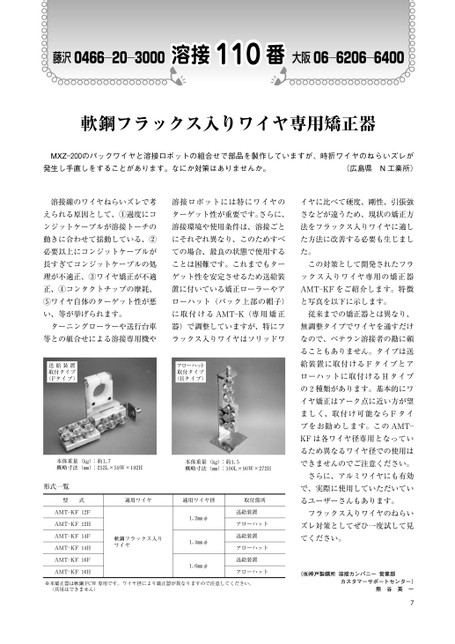 藤沢0466―20―3000溶接110番溶接番大阪06―6206―6400軟鋼フラックス入りワイヤ専用矯正器MXZ―200のパックワイヤと溶接ロボットの組合せで部品を製作していますが、時折ワイヤのねらいズレが発生し手直しをすることがあります。なにか対策はありませんか。(広島県N工業所)溶接線のワイヤねらいズレで考溶接ロボットには特にワイヤのイヤに比べて硬度、剛性、引張強えられる原因として、①過度にコターゲット性が重要です。さらに、さなどが違うため、現状の矯正方ンジットケーブルが溶接トーチの溶接環境や使用条件は、溶接ごと法をフラックス入りワイヤに適し動きに合わせて揺動している、②にそれぞれ異なり、このためすべた方法に改善する必要も生じまし必要以上にコンジットケーブルがての場合、最良の状態で使用するた。長すぎてコンジットケーブルの処ことは困難です。これまでもターこの対策として開発されたフラ理が不適正、③ワイヤ矯正が不適ゲット性を安定させるため送給装ックス入りワイヤ専用の矯正器正、④コンタクトチップの摩耗、置に付いている矯正ローラーやアAMT―KFをご紹介します。特徴⑤ワイヤ自体のターゲット性が悪ローハット(パック上部の帽子)と写真を以下に示します。い、等が挙げられます。に取付けるAMT―K(専用矯正従来までの矯正器とは異なり、ターニングローラーや送行台車器)で調整していますが、特にフ無調整タイプでワイヤを通すだけ等との組合せによる溶接専用機やラックス入りワイヤはソリッドワなので、ベテラン溶接者の勘に頼送給装置取付タイプ(Fタイプ)アローハット取付タイプ(Hタイプ)本体重量(㎏):約1.7概略寸法(㎜):252L×59W×192H本体重量(㎏):約1.5概略寸法(㎜):100L×90W×272H形式一覧型式適用ワイヤ適用ワイヤ径取付箇所AMT―KF12FAMT―KF12HAMT―KF14FAMT―KF14HAMT―KF16FAMT―KF16H軟鋼フラックス入りワイヤ1.2㎜φ1.4㎜φ1.6㎜φ送給装置アローハット送給装置アローハット送給装置アローハット※本矯正器は軟鋼FCW専用です。ワイヤ径により矯正器が異なりますので注意してください。(共用はできません)ることもありません。タイプは送給装置に取付けるFタイプとアローハットに取付けるHタイプの2種類があります。基本的にワイヤ矯正はアーク点に近い方が望ましく、取付け可能ならFタイプをお勧めします。このAMT―KFは各ワイヤ径専用となっているため異なるワイヤ径での使用はできませんのでご注意ください。さらに、アルミワイヤにも有効で、実際に使用していただいているユーザーさんもあります。フラックス入りワイヤのねらいズレ対策としてぜひ一度試して見てください。(㈱神戸製鋼所溶接カンパニー営業部カスタマーサポートセンター)熊谷英一7