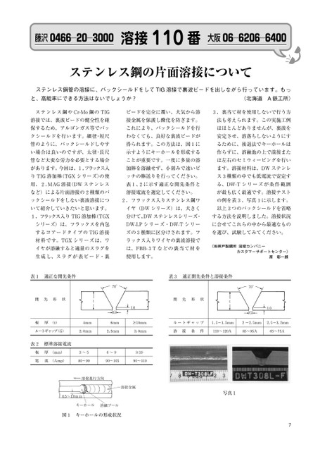藤沢0466―20―3000溶接110番大阪06―6206―6400ステンレス鋼の片面溶接についてステンレス鋼管の溶接に、バックシールドをしてTIG溶接で裏波ビードを出しながら行っています。もっと、高能率にできる方法はないでしょうか?(北海道A鉄工所)ステンレス鋼やCr-Mo鋼のTIGビードを完全に覆い、大気から溶3.裏当て材を使用しないで行う方溶接では、裏波ビードの健全性を確接金属を保護し酸化を防ぎます。法も考えられます。この実施工例保するため、アルゴンガス等でバッこれにより、バックシールドを行はほとんどありませんが、裏波をクシールドを行います。細径・短尺わなくても、良好な裏波ビードが安定させ、溶落ちしないようにす管のように、バックシールドしやす得られます。この方法は、図1にるために、後退法でキーホールはい場合は良いのですが、太径・長尺示すようにキーホールを形成する作らずに、溶融池の上で前後また管など大変な労力を必要とする場合ことが重要です。一度に多量の溶は左右のセミウィービングを行いがあります。今回は、1.フラックス入加棒を溶融せず、小刻みで速いピます。溶接材料は、DWステンレりTIG溶加棒(TGXシリーズ)の使ッチの棒送りを行ってください。ス3種類の中でも低電流で安定す用、2.MAG溶接(DWステンレス表1、2に示す適正な開先条件とる、DW-Tシリーズが条件範囲など)による片面溶接の2種類のバ溶接電流を選定してください。が最も広く最適です。溶接テストックシールドをしない裏波溶接につ2.フラックス入りステンレス鋼ワの例を表3、写真1に示します。いて紹介していきたいと思います。イヤ(DWシリーズ)は、大きく以上3つのバックシールドを省略1.フラックス入りTIG溶加棒(TGX分けて、DWステンレスシリーズ・する方法を説明しました。溶接状況シリーズ)は、フラックスを内包DW-LPシリーズ・DW-Tシリーに合せてこれらの中から最適なものするコアードタイプのTIG溶接ズの3種類に区分けされます。フを選び、試験してみてください。材料です。TGXシリーズは、ワラックス入りワイヤの裏波溶接でイヤが溶融すると適量のスラグをは、FBB-3Tなどの裏当て材を生成し、スラグが表ビード・裏使用します。(㈱神戸製鋼所溶接カンパニーカスタマーサポートセンター)原彰一朗表1適正な開先条件表3適正開先条件と溶接条件開先形状t板厚(t)4mm70°G6mmルートギャップ(G)2.0mm2.5mm1.010mm3.0mm表2標準溶接電流板電厚(mm)3〜56〜910流(Amp)80〜9090〜10590〜110溶接進行方向溶接金属0.5〜1.0mmキーホール溶融プール図1キーホールの形成状況開先形状t70°1.0Gルートギャップ1.3〜1.5mm2〜2.5mm2.5〜3.2mm溶接条件110〜120A85〜95A65〜75A写真17