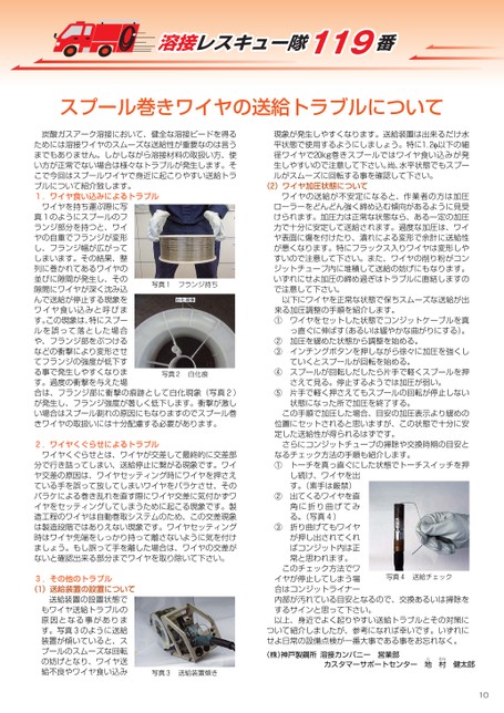 溶接レスキュー隊119番スプール巻きワイヤの送給トラブルについて炭酸ガスアーク溶接において、健全な溶接ビードを得るためには溶接ワイヤのスムーズな送給性が重要なのは言うまでもありません。しかしながら溶接材料の取扱い方、使い方が正常でない場合は様々なトラブルが発生します。そこで今回はスプールワイヤで身近に起こりやすい送給トラブルについて紹介致します。1.ワイヤ食い込みによるトラブル写真1フランジ持ちワイヤを持ち運ぶ際に写真1のようにスプールのフランジ部分を持つと、ワイヤの自重でフランジが変形し、フランジ幅が広がってしまいます。その結果、整列に巻かれてあるワイヤの並びに隙間が発生し、その隙間にワイヤが深く沈み込んで送給が停止する現象をワイヤ食い込みと呼びます。この現象は、特にスプールを誤って落とした場合や、フランジ部をぶつけるなどの衝撃により変形させてフランジの強度が低下する事で発生しやすくなります。過度の衝撃を与えた場合は、フランジ部に衝撃の痕跡として白化現象(写真2)が発生し、フランジ強度が著しく低下します。衝撃が激しい場合はスプール割れの原因にもなりますのでスプール巻きワイヤの取扱いには十分配慮する必要があります。白化痕写真22.ワイヤくぐらせによるトラブルワイヤくぐらせとは、ワイヤが交差して最終的に交差部分で行き詰ってしまい、送給停止に繋がる現象です。ワイヤ交差の原因は、ワイヤセッティング時にワイヤを押さえている手を誤って放してしまいワイヤをバラケさせ、そのバラケによる巻き乱れを直す際にワイヤ交差に気付かずワイヤをセッティングしてしまうために起こる現象です。製造工程のワイヤは自動巻取システムのため、この交差現象は製造段階ではありえない現象です。ワイヤセッティング時はワイヤ先端をしっかり持って離さないように気を付けましょう。もし誤って手を離した場合は、ワイヤの交差がないと確認出来る部分までワイヤを取り除いて下さい。現象が発生しやすくなります。送給装置は出来るだけ水平状態で使用するようにしましょう。特に1.2φ以下の細径ワイヤで20kg巻きスプールではワイヤ食い込みが発生しやすいので注意して下さい。尚、水平状態でもスプールがスムーズに回転する事を確認して下さい。(2)ワイヤ加圧状態についてワイヤの送給が不安定になると、作業者の方は加圧ローラーをどんどん強く締め込む傾向があるように見受けられます。加圧力は正常な状態なら、ある一定の加圧力で十分に安定して送給されます。過度な加圧は、ワイヤ表面に傷を付けたり、潰れによる変形で余計に送給性が悪くなります。特にフラックス入りワイヤは変形しやすいので注意して下さい。また、ワイヤの削り粉がコンジットチューブ内に堆積して送給の妨げにもなります。いずれにせよ加圧の締め過ぎはトラブルに直結しますので注意して下さい。以下にワイヤを正常な状態で保ちスムーズな送給が出来る加圧調整の手順を紹介します。①ワイヤをセットした状態でコンジットケーブルを真っ直ぐに伸ばす(あるいは緩やかな曲がりにする)。加圧を緩めた状態から調整を始める。インチングボタンを押しながら徐々に加圧を強くしていくとスプールが回転を始める。スプールが回転しだしたら片手で軽くスプールを押さえて見る。停止するようでは加圧が弱い。片手で軽く押さえてもスプールの回転が停止しない状態になった所で加圧を終了する。②③④⑤②③この手順で加圧した場合、目安の加圧表示より緩めの位置にセットされると思いますが、この状態で十分に安定した送給性が得られるはずです。さらにコンジットチューブの掃除や交換時期の目安となるチェック方法の手順も紹介します。①トーチを真っ直ぐにした状態でトーチスイッチを押し続け、ワイヤを出す。(素手は厳禁)出てくるワイヤを直角に折り曲げてみる。(写真4)折り曲げてもワイヤが押し出されてくればコンジット内は正常と思われます。3.その他のトラブル(1)送給装置の設置について送給装置の設置状態でもワイヤ送給トラブルの原因となる事があります。写真3のように送給装置が傾いていると、スプールのスムーズな回転の妨げとなり、ワイヤ送給不良やワイヤ食い込み写真4送給チェックこのチェック方法でワイヤが停止してしまう場合はコンジットライナー内部が汚れている目安となるので、交換あるいは掃除をするサインと思って下さい。以上、身近でよく起りやすい送給トラブルとその対策について紹介しましたが、参考になれば幸いです。いずれにせよ日常の設備点検が一番大事である事をお忘れなく。写真3送給装置傾き(株)神戸製鋼所溶接カンパニー営業部カスタマーサポートセンターじ地むら村健太郎10