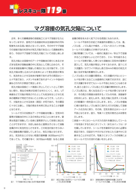マグ溶接の気孔欠陥について近年、多くの鋼構造物の溶接施工にはマグ溶接が主力と金属の靭性を大きく低下させる原因にもなります。なっていますが、使用される溶接材料は全溶接材料の70%シールド不良を引き起こす直接的な要因としては、風、程度を占める高い割合となっています。その中でマグ溶接ノズル径、ノズル高さや傾き、ノズルへのスパッタ付着、での溶接欠陥の約35%が気孔欠陥であるという調査結果もシールドガス流量などが挙げられます。あり、今回はマグ溶接での気孔欠陥についてお話し致しま○風の影響については、一般的に風速2m/秒以下で溶接す。することが望ましいとされており、2m/秒を超えると気孔欠陥とは溶接中のアークや溶融池の周りにあるさまシールド効果が著しく悪くなり溶融池に空気中の窒素がざまな気体が溶融金属の中に気泡として閉じ込められ、そ混入して、気孔欠陥が発生しやすくなります。図1にガのまま溶接金属中に残留した場合に生じる欠陥です。このス流量25/分でワイヤ突出し長さ20mmの場合の気孔欠気孔欠陥は閉じ込められる気体によって発生原因が異な陥に及ぼす風の影響を示します。り、気泡を生じさせる気体が窒素であればその原因はシー○ノズル径とガス流量の関係は、ガス流量が少ないとシールド不良であり、メタンや水素であればペイントや母材のルド性が悪くなることは直感的に判断できますが、逆に錆などの汚れが原因で発生します。ガス流量が多すぎてもシールド不良となることもありま気孔欠陥は溶接ビード表面に浮上してピットとして現れす。図2と図3にノズル径とガス流量の関係を示します。ない限り、発生の有無が目視では判りにくく、また、UT○ノズル高さは、高くなるほどシールド性が悪くなります検査などで欠陥が発見されたとしても気泡を生じさせた気が、その高さの限度は使用するノズルの内径、溶接継手体の種類まで特定できないことが多いようです。したがっの形状により、変化します。気孔欠陥に及ぼすノズル高て、欠陥を生じさせる気体(原因)が何であれ、その要因さの影響の一例を図4に示します。また、ノズルを極端に十分に注意し、欠陥の発生を未然に防止することが重要に傾け過ぎるとノズル後方に流れたガスが反転して溶接となります。アーク点方向に戻り、その時、空気を巻き込みシールドシールドガスの役割はアークや溶融池を覆い、空気中の不良となります。図5、写真1に空気の巻き込み状態を窒素が溶融池の中に入るのを防止することにあります。窒示します。素は高温で溶融している鉄に窒素原子として容易に溶込む○溶接トーチにはシールドガスの流れを層流化してシールことができますが、冷却し始めると窒素分子となって溶融ド性を良くするためにオリフィス(またはバッフル)が金属の中に気泡を生じさせます。この気泡が抜けきらない付属していますが、シールド性を確保するために必要な内に溶融金属が凝固してしまうと、気孔欠陥となります。部品であり、目詰まりや欠けなどが生じたら速やかに交また、気泡を生じさせない程度の窒素量(約200ppm以下)換することが大切です。写真2にオリフィスの有無によであっても、その量が多く(約150ppm程度)なると溶接るシールドガスの流れの違いを示します。ノズル径:12Φノズル径:18Φノズル径:26Φソリッドワイヤ(1.2Φ)溶接条件:300A-30cm/分シールドガス:Ar-20%CO2ワイヤ突出し長:20mm204080シールドガス流量(ℓ/分)60100600400200溶接金属中の窒素含有量(ppm)00ノズル径:12Φノズル径:18Φノズル径:26Φソリッドワイヤ(1.2Φ)溶接条件:300A-30cm/分シールドガス:Ar-20%CO2ワイヤ突出し長:20mm20406080100シールドガス流量(ℓ/分)800〜900600〜700400〜500200〜300804000気孔欠陥個数(個/200mm)図2気孔欠陥に及ぼすシールドガス流量ノズル形状の影響図3溶接金属中の窒素含有量に及ぼすシールドガス流量、ノズル形状の影響ワイヤ径:1.2Φ溶接条件:300A-30cpm溶接姿勢:下向シールドガス流量:25ℓ/分ワイヤ突出し長:20mmソリッドワイヤAr+20%CO2ソリッドワイヤ100%CO2フラックス入りワイヤ100%CO212風速(m/秒)3450040030020010000気孔欠陥個数(個/200mm)図1マグ溶接の気孔欠陥に及ぼす風速の影響9
