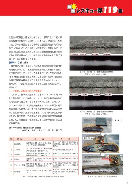 上:ビード外観下:放射線透過試験結果写真1バックステップあり上:ビード外観下:放射線透過試験結果写真2バックステップなしに発生する気孔欠陥を消し去ります。写真1と2は低水素系溶接棒で溶接を行った際、バックステップ法で行ったものと、アークを発生させてそのまま溶接を開始したバックステップなしのものを比較した写真です。写真2もビード表面上には欠陥は見当たりませんが放射線透過試験で確認すると溶接金属中のビード継目部分に多数の気孔欠陥(ブローホール)が散見できます。【要領-2】捨て金法捨て金法とは、スクラップ材等の適当な金属片(捨て金)を用意します。これを溶接開始位置付近に準備して置き、この捨て金の上で一旦アークを発生させアークが安定した所で(棒先端が真っ赤な状態になるまで)素早く溶接開始位置に溶接棒を移動させて本溶接をスタートさせます。つまりスタート時の気孔欠陥を捨て金に捨て去る方法です。(写真3)4.その他、溶接施工時の注意事項これまで、低水素系溶接棒によるアークスタート時の気孔欠陥対策について説明しましたが、非低水素系溶接棒でも同じ要領で施工されることをお奨めします。また、アークスタート時以外での気孔欠陥発生についての原因と対策を表2に示します。尚、すべての溶接に共通することですが、特に低水素系溶接棒は重要部材に用いられることが多いため、施工に際しては事前の溶接材料や溶接部材の管理は基より、溶接技量、作業環境などにも十分配慮することが重要です。(株)神戸製鋼所溶接事業部門営業部カスタマーサポートセンター皆川勝己項目要因原因対策1母材表面2アーク長3溶接電流4棒角度母材表面に付着している「錆、油脂、水分」等が溶接金属に残る。グラインダー研削や有機溶剤による脱脂を施し、母材表面をキレイに仕上げる。アーク長が長すぎると、大気中の窒素が溶接金属に巻き込まれる。アーク長をできるだけ短く保つ。電流が高すぎると保護筒が欠ける。被覆剤が焼損する。(棒焼け)姿勢に応じた適正な電流で施工する。鋭角過ぎるとシールドガスが溶接金属を十分に保護しない。姿勢に応じた適正な棒角度で施工する。5ウィービング幅振り幅が多過ぎるとシールドガスが溶接金属を十分に保護しない。6風の影響風によりシールドガスが飛ばされる。棒径の3倍以下で施工する(棒径4mmの場合、ウィービング幅は12mm以内)風速3m/秒以下、およびこの範囲内であっても適切な防風処置をして施工する。表2溶接施工時における気孔欠陥発生の原因と対策写真3捨て金法による気孔欠陥対策12