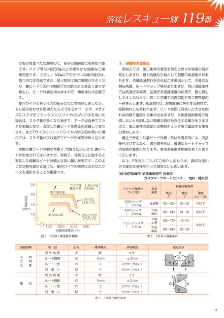 のものを並べた状態なので、多少の曲線部にも対応可能3.溶接時の注意点です。パイプ等も内径500φ以上の緩やかな曲線なら使実施工では、施工条件の選定を誤ると様々な溶接欠陥が用可能です。ただし、500φ以下のきつい曲線の場合は、発生しますが、最も危険な欠陥として初層の高温割れがあ取り付けは可能ですが、耐火物同士間の隙間が大きくなります。初層高温割れを引き起こす要因として、不適切なり、裏ビードに30mm間隔で竹の節のような出っ張りが開先角度、ルートギャップ等がありますが、特に溶接条件発生し、ビード外観を損ねますので、事前検討が必要ででは高過ぎる電流、速過ぎる溶接速度の採用で、最も発生す。しやすくなります。図1に初層での高温割れ発生限界線の使用ワイヤと各サイズの組み合わせを前述しましたが、一例を示します。高温割れは、溶接直後に発生する割れで、もし組み合わせを間違えたらどうなるか?まず、Aサイ凝固割れとも言われます。ビード表面に発生した大きな割ズにスラグ系フラックス入りワイヤのDW-Z100を用いたれは肉眼で確認する事が出来ますが、X線透過試験等で確場合は、スラグ量が多くなり過ぎて、アーク点近傍でスラ認しないと判明しない微細な割れも発生する事がありますグが邪魔となり、安定した裏ビードを得るのが難しくなりので、施工条件の選定には事前チェック等で確認する事をます。またTサイズにソリッドワイヤのMG-50を用いた場お奨めします。合では、スラグ量が少な過ぎてビードの光沢が無くなりま健全で安定した裏ビード外観・形状を得る為には、溶接す。条件だけではなく、適正開先形状、最適なルートギャップ実際の裏ビード外観を写真4、写真5に示します。裏ビーの保持が重要となります。推奨溶接条件範囲を表1と表2ドが形成されてはいますが、写真2、写真3と比較するとに示します。安定した綺麗なビード外観とは言い難い状態です。このよ以上、FB-B3についてご紹介しましたが、適切な使いうな状態を避ける為にも、使用ワイヤの種類に合わせたサ方で健全な溶接を行って頂きたいと思います。イズを選択することが重要です。(株)神戸製鋼所溶接事業部門営業部カスタマーサポートセンター地村健太郎ワイヤの種類とワイヤ径溶接姿勢DWシリーズ1.2mmφMXシリーズ1.2mmφソリッドワイヤ1.2mmφ全姿勢下向横向立向上進下向横向初層溶接条件電流A電圧V速度cm/min180〜220200〜240120〜170200〜24022〜2615以下24〜2820以下16〜2125〜2920以下MG-50(Aサイズ)DW-Z100(Tサイズ)30010割れない域150200250初層溶接電流(A)ワイヤ径:1.2mmφ裏あて材:FB-B3割れ発生域252015溶接速度(cpm)4図1FB-B3高温割れ範囲表2FB-B3溶接条件Gθ開先形状MRMGθR標準開先45°5mm0045°5mm00許容範囲±5°±2mm2mm(max.)2mm(max.)±5°±2mm2mm(max.)2mm(max.)表1FB-B3開先条件記号GRMGRM項目開先角度ルート間隔ルート面目違い開先角度ルート間隔ルート面目違い溶接姿勢下立上向向進横向