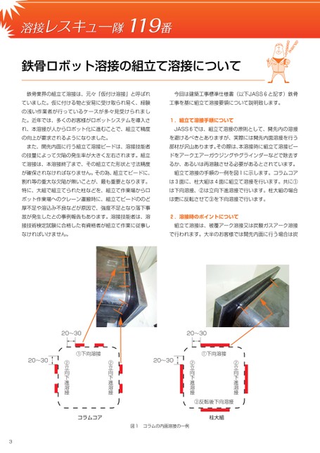 鉄骨ロボット溶接の組立て溶接について鉄骨業界の組立て溶接は、元々『仮付け溶接』と呼ばれ今回は建築工事標準仕様書(以下JASS6と記す)鉄骨ていました。仮に付ける物と安易に受け取られ易く、経験工事を基に組立て溶接要領について説明致します。の浅い作業者が行っているケースが多々見受けられました。近年では、多くのお客様がロボットシステムを導入さ1.組立て溶接手順についてれ、本溶接が人からロボット化に進むことで、組立て精度JASS6では、組立て溶接の原則として、開先内の溶接の向上が要求されるようになりました。を避けるべきとありますが、実際には開先内面溶接を行うまた、開先内面に行う組立て溶接ビードは、溶接技能者部材が沢山あります。その際は、本溶接時に組立て溶接ビーの技量によって欠陥の発生率が大きく左右されます。組立ドをアークエアーガウジングやグラインダーなどで除去すて溶接は、本溶接終了まで、その組立てた形状と寸法精度るか、あるいは再溶融させる必要があるとされています。が確保されなければなりません。その為、組立てビードに、組立て溶接の手順の一例を図1に示します。コラムコア割れ等の重大な欠陥が無いことが、最も重要となります。は3面に、柱大組は4面に組立て溶接を行います。共に①特に、大組で組立てられた柱などを、組立て作業場からロは下向溶接、②は立向下進溶接で行います。柱大組の場合ボット作業場へのクレーン運搬時に、組立てビードののどは更に反転させて③を下向溶接で行います。厚不足や溶込み不良などが原因で、強度不足となり落下事故が発生したとの事例報告もあります。溶接技能者は、溶2.溶接時のポイントについて接技術検定試験に合格した有資格者が組立て作業に従事し組立て溶接は、被覆アーク溶接又は炭酸ガスアーク溶接なければいけません。で行われます。大半のお客様では開先内面に行う場合は炭20〜3020〜30コラムコア図1コラムの内面溶接の一例③反転後下向溶接柱大組②立向下進溶接①下向溶接②立向下進溶接20〜30②立向下進溶接①下向溶接②立向下進溶接20〜303