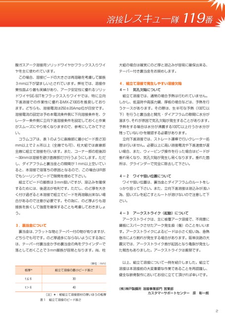 酸ガスアーク溶接用ソリッドワイヤかフラックス入りワイ大組の場合は確実にのど厚と溶込みが容易に確保出来る、ヤを主に使われています。テーパー付き裏当金をお奨めします。この場合、溶接ビードの大きさは再溶融を考慮して脚長3mm以下が望ましいとされています。弊社では、溶接作4.組立て溶接で発生しやすい溶接欠陥業性面より最も実績があり、アーク安定性に優れるソリッ4-1気孔欠陥についてドワイヤSE-0Tをフラックス入りワイヤでは、特に立向組立て溶接では、通常の場合予熱は行われていません。下進溶接での作業性に優れるMX-Z100Sを推奨しておりしかし、低温時や高張力鋼、厚板の場合などは、予熱を行ます。どちらも、溶接電流は250±20Amp位が目安です。うケースがあります。その際は、生半可な予熱(100℃以溶接電流の設定は予め本電流条件側に下向溶接条件を、ク下)を行うと裏当金と開先・ダイアフラムの隙間に水分がレーター条件側に立向下進溶接条件を設定しておくと作業溜まり、それが原因で気孔欠陥が発生することがあります。がスムーズにやり易くなりますので、参考にしてみて下さ予熱をする場合は水分が沸騰する100℃以上行うか水分がい。残っていないかを確認する必要があります。コラムコアは、表1のように直線部に最小ビード長さ30立向下進溶接では、ストレート運棒で行いクレーター処mm以上で2ヵ所以上(全線でも可)、柱大組では直線部理は行いません。必要以上に高い溶接電流や下進速度が遅全線に組立て溶接を行います。また、コーナー部の前後20い場合、また、ウィービング操作を行った場合はビードが〜30mmは溶接を避け直線部だけ行うようにします。ただ垂れ易くなり、気孔欠陥が発生し易くなります。垂れた箇し、ダイアフラムと裏当金との隙間が1mm以上空いてい所は、グラインダーで完全に除去して下さい。ると、本溶接で溶落ちの原因となるので、この場合はR部でもシーリングビードで隙間を埋めて下さい。4-2ワイヤ狙い位置について組立てビードの脚長は3mm狙いですが、溶込みを確保ワイヤ狙い位置は、裏当金とダイアフラムのルートをしするためには、後退法が有利です。ただし、のど厚を大きっかり狙って下さい。また、立向下進溶接は溶込みが浅いく付け過ぎると本溶接で組立てビードを再溶融出来ない場為、狙いズレを起こすとルートが溶けないので注意して下合があるので注意が必要です。その為に、のど厚よりも溶さい。接長を長くして強度を確保することも考慮しておきましょう。3.裏当金について4-3アークストライク(起動)についてアークストライクは、主に被覆アーク溶接で、不用意に鋼板にスパークさせたアーク発生痕(傷)のことをいいま裏当金は、フラットな物とテーパー付の物が有りますが、す。アークストライクによるビードは小さく短い為、急熱どちらでも可です。のど厚過多にならないようにする為に急冷により割れが発生する場合があります。阪神淡路の大は、テーパー付裏当金か予め裏当金の角をグラインダーで震災では、アークストライク痕が起因となり亀裂が発生し落としておくことで3mm脚長が容易となります。尚、柱た報告もありました。アークストライクは厳禁です。(単位:mm)以上、組立て溶接について一例を紹介しました。組立て板厚*t≦6t>6組立て溶接の最小ビード長さ3040[注]*:被組立て溶接部材の厚いほうの板厚表1組立て溶接のビード長さ溶接は本溶接前の大変重要な作業であることを再認識し、健全な鉄骨製作においてお役に立てて頂ければ幸いです。(株)神戸製鋼所溶接事業部門営業部カスタマーサポートセンター原彰一朗2