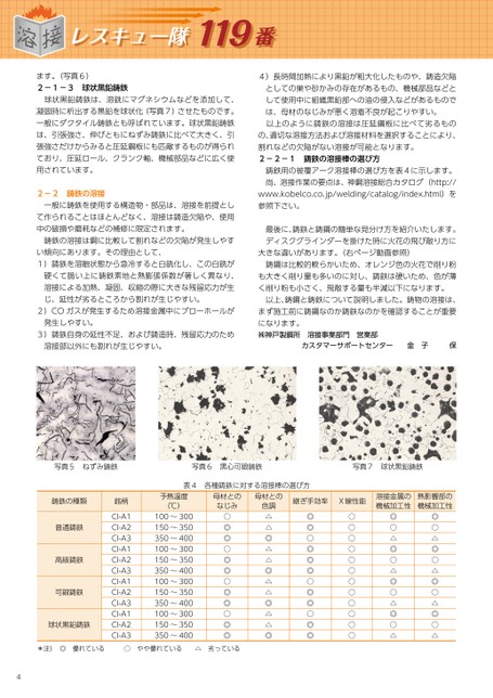 レスキュー隊119番レスキュー隊119番ます。(写真6)2-1-3球状黒鉛鋳鉄球状黒鉛鋳鉄は、溶銑にマグネシウムなどを添加して、凝固時に析出する黒鉛を球状化(写真7)させたものです。一般にダクタイル鋳鉄とも呼ばれています。球状黒鉛鋳鉄は、引張強さ、伸びともにねずみ鋳鉄に比べて大きく、引張強さだけからみると圧延鋼板にも匹敵するものが得られており、圧延ロール、クランク軸、機械部品などに広く使用されています。2-2鋳鉄の溶接一般に鋳鉄を使用する構造物・部品は、溶接を前提として作られることはほとんどなく、溶接は鋳造欠陥や、使用中の破損や磨耗などの補修に限定されます。鋳鉄の溶接は鋼に比較して割れなどの欠陥が発生しやすい傾向にあります。その理由として、1)鋳鉄を溶融状態から急冷すると白銑化し、この白銑が硬くて脆い上に鋳鉄素地と熱膨張係数が著しく異なり、溶接による加熱、凝固、収縮の際に大きな残留応力が生じ、延性が劣るところから割れが生じやすい。2)COガスが発生するため溶接金属中にブローホールが発生しやすい。3)鋳鉄自身の延性不足、および鋳造時、残留応力のため溶接部以外にも割れが生じやすい。4)長時間加熱により黒鉛が粗大化したものや、鋳造欠陥としての巣や砂かみの存在があるもの、機械部品などとして使用中に組織黒鉛部への油の侵入などがあるものでは、母材のなじみが悪く溶着不良が起こりやすい。以上のように鋳鉄の溶接は圧延鋼板に比べて劣るものの、適切な溶接方法および溶接材料を選択することにより、割れなどの欠陥がない溶接が可能となります。2-2-1鋳鉄の溶接棒の選び方鋳鉄用の被覆アーク溶接棒の選び方を表4に示します。尚、溶接作業の要点は、神鋼溶接総合カタログ(http://www.kobelco.co.jp/welding/catalog/index.html)を参照下さい。最後に、鋳鉄と鋳鋼の簡単な見分け方を紹介いたします。ディスクグラインダーを掛けた時に火花の飛び散り方に大きな違いがあります。(右ページ動画参照)鋳鋼は比較的軟らかいため、オレンジ色の火花で削り粉も大きく削り量も多いのに対し、鋳鉄は硬いため、色が薄く削り粉も小さく、飛散する量も半減以下になります。以上、鋳鋼と鋳鉄について説明しました。鋳物の溶接は、まず施工前に鋳鋼なのか鋳鉄なのかを確認することが重要になります。㈱神戸製鋼所溶接事業部門営業部カスタマーサポートセンター金子保写真5ねずみ鋳鉄写真6黒心可鍛鋳鉄写真7球状黒鉛鋳鉄表4各種鋳鉄に対する溶接棒の選び方鋳鉄の種類普通鋳鉄高級鋳鉄可鍛鋳鉄球状黒鉛鋳鉄銘柄CI-A1CI-A2CI-A3CI-A1CI-A2CI-A3CI-A1CI-A2CI-A3CI-A1CI-A2CI-A3予熱温度(℃)100~300150~350350~400100~300150~350350~400100~300150~350350~400100~300150~350350~400母材とのなじみ○◎◎○◎◎○◎◎○◎◎*注)◎優れている○やや優れている△劣っている4母材との色調△△◎△△◎△△◎△△◎継ぎ手効率X線性能◎◎○◎◎◎○◎◎○◎◎○○○○○○○○○○○○溶接金属の機械加工性◎○△◎○△◎○△◎○△熱影響部の機械加工性◎○△◎○△◎○△◎○△