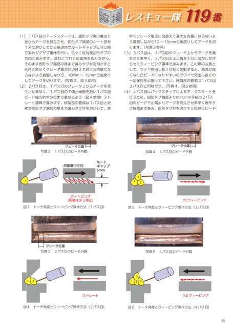 (1)1パス目のアークスタートは、固形タブ奥の裏当て金からアークを発生させ、固形タブ端部のルート部を十分に溶かしてから後退角でルートギャップと同じ幅で斜めジグザグ運棒を行い、徐々に反対側固形タブの方向に進みます。進むにつれて前進角を取りながら、そのまま固形タブ端部の奥まで進みタブ材を溶かすと同時に素早くクレータ電流に切替えて過大な肉量にならないよう調整しながら、10mm~15mm位後戻りしてアークを切ります。(写真2、図3参照)(2)2パス目は、1パス目のクレータ上からアークを発生させ素早く、1パス目の下側止端部を狙い1パス目ビード幅の約半分位まで重なるよう(図4参照)ストレート運棒で進みます。終端部の要領は1パス目と同様で固形タブ端部の奥まで進みタブ材を溶かして、素レスキュー隊119番早くクレータ電流に切替えて過大な肉量にならないよう調整しながら10~15mm位後戻りしてアークを切ります。(写真3参照) 3)3パス目は、2パス目のクレータ上からアークを発生させ素早く、2パス目の上止端を十分に溶かしながらセミウィービング運棒で進みます。この際の注意として、ワイヤ突出し長さが短く変動すると、電流が高くなり凸ビードになりやすいのでワイヤ突出し長さの一定保持を心掛けて下さい。終端部の要領は1パス目2パス目と同様です。(写真4、図5参照) 4)4パス目はバックステップによるアークスタートを行うため、固形タブ端部より約10mm手前の2パス目のビード下止端よりアークを発生させ素早く固形タブ端部まで進み、固形タブ材を溶かすと同時にビードクレータ位置写真21パス目のビード外観クレータ位置写真43パス目のビード外観溶接進行方向ルートギャップ6mm1312ウィービング(両端は少し停止)セミウィービング図3トーチ角度とウィービング操作方法(1パス目)図5トーチ角度とウィービング操作方法(3パス目)15ストレートセミウィービング図4トーチ角度とウィービング操作方法(2パス目)図6トーチ角度とウィービング操作方法(4パス目)423112クレータ位置写真32パス目のビード外観写真54パス目のビード外観