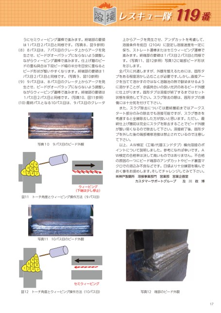 レスキュー隊119番上からアークを発生させ、アンダカットを考慮して、溶接条件を低目(210A)に設定し溶接速度を一定に保ち、ストレート運棒またはセミウィービング運棒で進みます。終端部の要領は1パス目2パス目と同様です。(写真11、図12参照)写真12に端部ビード形状を示します。全パスに共通しますが、外観を整えるためには、固形タブをある程度溶かし込むことが必要です。しかし、直接アークを当てて溶かすのではなく溶融池の熱で馴染ませるように溶かすことが、余盛具合いの良い光沢のあるビード外観に仕上がります。固形タブは溶接が終了するまではセット状態を保持して下さい。スラグ除去の際は、固形タブの損傷には十分気を付けて下さい。また、スラグ除去については最終層前まではアークスタート部分のみの除去でも溶接可能ですが、スラグ巻きを考慮すると全線除去した方が良いと思います。ただし、最終仕上げ層前は完全にスラグを除去することでビード外観が整い易くなるので除去して下さい。溶接終了後、固形タブを外した後の端部補修溶接は禁止されているので注意して下さい。以上、AW検定(工場/代替エンドタブ)横向溶接のポイントについて説明しました。参考になれば幸いです。AW検定の合格率は決して高いものではありません。不合格の原因の一つにビード端部のアンダカットやビード裏面マクロでの溶込み不良などです。日頃より十分練習を積んでおく事をお奨めします。そしてチャレンジしてみて下さい。㈱神戸製鋼所溶接事業部門営業部営業企画室カスタマーサポートグループ及川政博うにセミウィービング運棒で進みます。終端部の要領は1パス目2パス目と同様です。(写真8、図9参照) 8)8パス目は、7パス目のクレータ上からアークを発生させ、ビードがオーバラップにならないよう調整しながらウィービング運棒で進みます。仕上げ層のビードの重ね具合は下段ビード幅の半分を目安に重ねるとビード形状が整いやすくなります。終端部の要領は1パス目2パス目と同様です。(写真9、図10参照)(9)9パス目は、8パス目のクレータ上からアークを発生させ、ビードがオーバラップにならないよう調整しながらウィービング運棒で進みます。終端部の要領は1パス目2パス目と同様です。(写真10、図11参照) 10)最終パスとなる10パス目は、9パス目のクレータ写真109パス目のビード外観(下端は少し停止)図11トーチ角度とウィービング操作方法(9パス目)ウィービング789456231写真1110パス目のビード外観10987654321図12トーチ角度とウィービング操作方法(10パス目)写真12端部のビード外観セミウィービング17