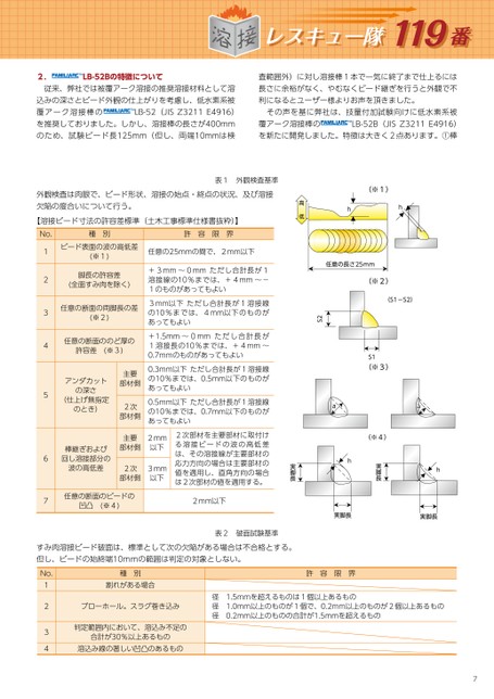 B-52Bの特徴について2. 従来、弊社では被覆アーク溶接の推奨溶接材料として溶込みの深さとビード外観の仕上がりを考慮し、低水素系被覆アーク溶接棒のを推奨しておりました。しかし、溶接棒の長さが400mmのため、試験ビード長125mm(但し、両端10mmは検LB-52(JISZ3211E4916)レスキュー隊119番査範囲外)に対し溶接棒1本で一気に終了まで仕上るには長さに余裕がなく、やむなくビード継ぎを行うと外観で不利になるとユーザー様よりお声を頂きました。その声を基に弊社は、技量付加試験向けに低水素系被覆アーク溶接棒のを新たに開発しました。特徴は大きく2点あります。①棒LB-52B(JISZ3211E4916)表1外観検査基準外観検査は肉眼で、ビード形状、溶接の始点・終点の状況、及び溶接欠陥の度合いについて行う。【溶接ビード寸法の許容差標準(土木工事標準仕様書抜粋)】No.種別許容限界高低(※1)hh任意の長さ25mm(※2)(S1-S2)S2S1(※3)h(※4)実脚長haa実脚長実脚長ビード表面の波の高低差(※1)脚長の許容差(全面すみ肉を除く)任意の断面の両脚長の差(※2)任意の断面ののど厚の許容差(※3)アンダカットの深さ(仕上げ無指定のとき)主要部材側2次部材側任意の25mmの間で、2mm以下+3mm~0mmただし合計長が1溶接線の10%までは、+4mm~-1のものがあってもよい3mm以下ただし合計長が1溶接線の10%までは、4mm以下のものがあってもよい+1.5mm~0mmただし合計長が1溶接長の10%までは、+4mm~0.7mmのものがあってもよい0.3mm以下ただし合計長が1溶接線の10%までは、0.5mm以下のものがあってもよい0.5mm以下ただし合計長が1溶接線の10%までは、0.7mm以下のものがあってもよい実脚長主要部材側2mm以下2次部材側3mm以下2次部材を主要部材に取付ける溶接ビードの波の高低差は、その溶接線が主要部材の応力方向の場合は主要部材の値を適用し、直角方向の場合は2次部材の値を適用する。棒継ぎおよび回し溶接部分の波の高低差任意の断面のビードの凹凸(※4)2mm以下1234567すみ肉溶接ビード破面は、標準として次の欠陥がある場合は不合格とする。但し、ビードの始終端10mmの範囲は判定の対象としない。表2破面試験基準No.1234種別割れがある場合ブローホール。スラグ巻き込み判定範囲内において、溶込み不足の合計が30%以上あるもの溶込み線の著しい凹凸のあるもの許容限界径1.5mmを超えるものは1個以上あるもの径1.0mm以上のものが1個で、0.2mm以上のものが2個以上あるもの径0.2mm以上のものの合計が1.5mmを超えるもの7