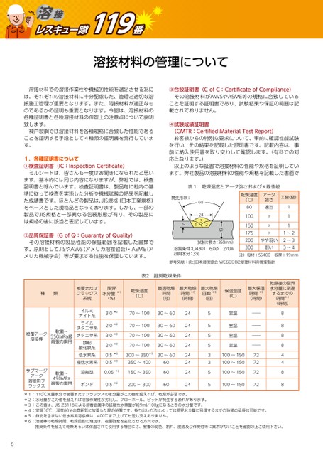 ③合致証明書(CofC:CerticateofCompliance)その溶接材料がAWSやASME等の規格に合致していることを証明する証明書であり、試験結果や保証の範囲は記載されておりません。(CMTR:CertiedMaterialTestReport)④試験成績証明書お客様からの特別な要求について、事前に確認性能試験を行い、その結果を記載した証明書です。記載内容は、事前に納入使用書を取り交わして確認します。(有料での対応となります。)以上のような証書で溶接材料の性能や規格を証明しています。弊社製品の溶接材料の性能や規格を記載した書面で表1乾燥温度とアーク強さおよびX線性能乾燥温度(℃)80100150175200300アーク強さ適当〃〃〃やや弱い弱いX線(級)1111~22~33~4注)母材:SS400板厚:19mm1960°2432開先形状:71(試験片長さ:350mm)溶接条件:D43016.0φ270A初期水分:3%参考文献:(社)日本溶接協会WES2302溶接材料の管理指針溶接材料での溶接作業性や機械的性能を満足させる為には、それぞれの溶接材料に十分配慮した、管理と適切な溶接施工管理が重要となります。また、溶接材料が適正なものであるかの証明も重要となります。今回は、溶接材料の各種証明書と各種溶接材料の保管上の注意点について説明致します。神戸製鋼では溶接材料を各種規格に合致した性能であることを証明する手段として4種類の証明書を発行しています。1.各種証明書について①検査証明書(IC:InspectionCerticate)ミルシートは、皆さんも一度はお聞きになられたと思います。基本的には同じ内容になりますが、弊社では、検査証明書と呼んでいます。検査証明書は、製品毎に社内の基準に従って検査を実施した分析や機械試験の結果を記載した成績書です。ほとんどの製品は、JIS規格(日本工業規格)をベースとした規格品となっております。しかし、一部の製品でJIS規格と一部異なる包装形態が有り、その製品には規格の後に該当と表記しています。②品質保証書(GofQ:GuarantyofQuality)その溶接材料の製品性能の保証範囲を記載した書類です。原則としてJISやAWS(アメリカ溶接協会)・ASME(アメリカ機械学会)等が要求する性能を保証しています。表2推奨乾燥条件溶接レスキュー隊119番溶接材料の管理について限界水分量*1(%)乾燥温度(℃)最適乾燥時間(分)種類被覆アーク溶接棒軟鋼~550MPa級高張力鋼用被覆またはフラックス系統イルミナイト系ライムチタニヤ系チタニヤ系鉄粉酸化鉄系低水素系極低水素系3.0*22.0*23.0*22.0*20.5*30.5*3サブマージアーク溶接用フラックス軟鋼~490MPa高張力鋼用溶融型0.05*2150~350ボンド0.5*2200~300最大乾燥時間*6(時間)最大乾燥回数*6(回)保温温度(℃)最大保温時間*6(時間)242424242424242455553355室温室温室温室温100~150100~150100~150100~150――――――――72727272乾燥後の限界水分量に到達するまでの時間*4(時間)8888448870~10030~6070~10030~6070~10030~6070~10030~60300~350*530~60350~400606060*1:110℃減量水分で被覆またはフラックスの水分量がこの値を超えれば、乾燥が必要です。*2:水分量がこの値を超えれば溶接作業性が劣化し、ブローホール、ピットが発生する恐れがあります。*3:この値は、JISZ3118による溶着金属中の拡散性水素量が約9ml/100gになるときの水分量です。*4:室温30℃、湿度80%の雰囲気に放置した際の時間です。持ち出し方法によっては限界水分量に到達するまでの時間の延長は可能です。*5:鉄粉を含まない低水素系溶接棒は、400℃まで上げても差し支えありません。*6:溶接棒の乾燥時間、乾燥回数の増加は、被覆強度を劣化させる方向です。推奨条件を超えて乾燥あるいは保温されて使用する場合には、被覆の変色、割れ、脱落及び作業性等に異常がないことを確認の上ご使用下さい。6