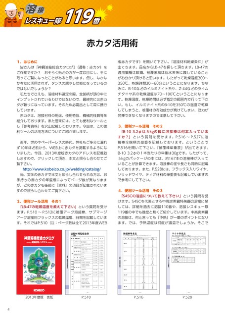 ワイヤ単重表フラックス入りワイヤ長さ(m/10kg)ワイヤ径0.91.1.1.62.02.3.2--2500-410930-044960-077610-099931,501,90----DWワイヤMXワイヤOWワイヤ炭素鋼用ステンレス鋼用DWワイヤ2,5101,60-780---ソリッドワイヤ長さ(m/10kg)ワイヤ径(mm)0.60.80.91.01.21.41.62.0炭素鋼用4,402,5502,0201,6301,130830640410620400ステンレス鋼-2,4001,9401,6001,100-ティグ材料の単重(g/m)ワイヤ径(mm)炭素鋼用ステンレス鋼用1.15.716.12.24.525.22.435.36.資料(ワイヤ単重表)―516―P.516―528―P.528溶接レスキュー隊119番赤カタ活用術1.はじめに皆さんは『神鋼溶接総合カタログ』(通称;赤カタ)をご存知ですか?おそらく殆どの方が一度は目にし、手に取ってご覧になったことがあると思います。但し、なかなか有効に活用されず、タンスの肥やし状態になっているのではないでしょうか?私たちでさえも、溶接材料選定の際、全銘柄が頭の中にインプットされているわけではないので、最終的には赤カタが頼りになっています。そのため必需品として常に携行しています。赤カタは、溶接材料の用途、使用特性、機械的性質等を紹介しております。また巻末には、とても便利なツールとし『参考資料』を沢山記載しております。今回は、この便利ツールの活用方法についてご紹介致します。近年、世の中ペーパーレスの時代。弊社もご多分に漏れず10年ほど前から、WEB上に赤カタを掲載するようになりました。今回、2013年度版赤カタのアドレスを記載致しますので、クリックして頂き、本文と照らし合わせてご覧下さい。http://www.kobelco.co.jp/welding/catalog/尚、実体の赤カタで本文と照らし合わせられる方は、お手持ちの赤カタの年度版によってページ数が異なりますが、どの赤カタも後部に『資料』の項目が記載されていますので照らし合わせてご覧下さい。2.便利ツール活用その1「LB-47の乾燥温度を教えて下さい」という質問を受けます。P.510~P.512に被覆アーク溶接棒、サブマージアーク溶接用フラックスの乾燥温度、時間を記載しています。それではP.510(注:ページ数は全て2013年度WEB版赤カタです)を開いて下さい。『溶接材料乾燥条件』が出てきます。品名からLB-47を探して頂きます。LB-47の適用鋼種は軟鋼、被覆系統は低水素系に属していることがお分かり頂けると思います。したがって乾燥温度300~350℃、乾燥時間30~60分ということになります。ちなみに、B-10などのイルミナイト系や、Z-44などのライムチタニヤ系の乾燥温度は70~100℃ということになります。乾燥温度、乾燥時間は必ず指定の範囲内で行って下さい。もし、イルミナイト系のB-10を350℃の温度で乾燥してしまうと、被覆材の有効成分が焼けてしまい、効力が発揮できなくなりますので注意して下さい。3.便利ツール活用その2「B-103.2φは5kgの箱に溶接棒は何本入っていますか?」という質問を受けます。P.516~P.527に溶接棒全銘柄の単重を記載しております。ということでP.516を開いて下さい。『被覆棒単重表』が出てきます。B-103.2φの1本当たりの単重は30gです。したがって、5kgのパッケージの中には、約167本の溶接棒が入っていることが計算できます。溶接棒の径や長さも同時に記載してあります。また、P.528には、フラックス入りワイヤ、ソリッドワイヤ、ティグ材料の単重表も記載していますので参考にして下さい。4.便利ツール活用その3「S45Cの溶接について教えて下さい」という質問を受けます。S45Cを代表とする中高炭素鋼特殊鋼の溶接に関しては、詳細を過去に溶接110番や、溶接レスキュー隊119番の中でも幾度と無くご紹介しています。中高炭素鋼の溶接は、何と言っても『予熱』が一番のポイントになります。では、予熱温度は何度が適温でしょうか。そこで溶接材料乾燥条件1.被覆棒被覆棒単重表ここで示す単重は計算値であり、製品とは多少異なる場合があります。サイズmm長350350400400400450350400450450450450550単重g/本19305668841362036627997144233400450350350400400450450193157647185154209450550276337300350350400400450350400400400450450450450550300350400450450102030558213831558638688410417721617305495135径2.63.24.04.55.06.02.63.24.04.55.06.07.02.63.24.04.55.06.07.08.02.02.63.24.05.06.03.24.05.03.24.04.55.06.02.63.24.05.06.0鋼種被覆の系統品名温度時間品名B-0B-4B-7B-3BA-7BI14BL-76資料(被覆棒単重表)イルミナイト系B-10,B-14,B-17,BI-470〜100℃30〜60分ライムチタニヤ系TB-4,TB-I4,TB-43,Z-4470〜100℃30〜60分高酸化チタン系RB-26,B-3370〜100℃30〜60分低水素系LB-6,LB-26V,LB-47,LB-2U,Z-6VLB-7A鉄粉酸化鉄系Z-27特殊系Z-43FPB-3,SG-0イルミナイト系BA-47300〜350℃350〜400℃30〜60分60分70〜100℃30〜60分70〜100℃30〜60分70〜100℃30〜60分70〜100℃30〜60分ライムチタニヤ系TB-W52,TB-W52B70〜100℃30〜60分低水素系LB-52,LB-A52,LB-52,LB-50WT,LB-52CLLB-52B300〜350℃350〜400℃30〜60分60分ライムチタニヤ系LT-5070〜100℃30〜60分300〜350℃350〜400℃350〜430℃30〜60分60分60分低水素系LB-4,LB-52,LB-52T,LB-6,LT-B52ALB-2A,LB-52V,LB-7,LB-62,LB-2L,LB-62U,LB-06,LB-116,LB-52,LB-0EMLB-2UL,LB-62UL,LB-0UL,LB-88LT―510―P.510軟鋼耐耐耐候海性水硫酸腐食鋼鋼鋼高張力鋼資料(溶接材料乾燥条件)2013年度版表紙4