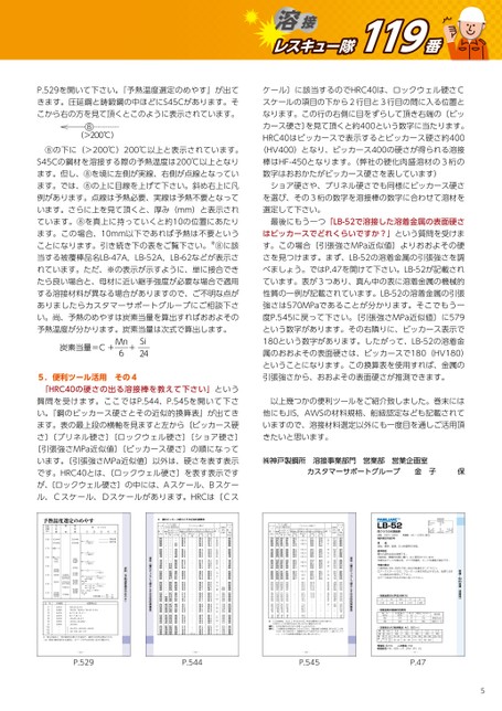 レスキュー隊119番溶接きます。圧延鋼と鋳鍛鋼の中ほどにS45Cがあります。そP.529を開いて下さい。『予熱温度選定のめやす』が出てこから右の方を見て頂くとこのように表示されています。予熱温度が分かります。炭素当量は次式で算出します。ありましたらカスタマーサポートグループにご相談下さする溶接材料が異なる場合がありますので、ご不明な点がれています。ただ、※の表示が示すように、単に接合でき当する被覆棒品名LB-47A,LB-52A,LB-62などが表示さことになります。引き続き下の表をご覧下さい。※⑧に該ています。⑧を真上に持っていくと約10の位置にあたりいます。さらに上を見て頂くと、厚み(mm)と表示されます。では、⑧の上に目線を上げて下さい。斜め右上に凡ます。但し、⑧を境に左側が実線、右側が点線となっていS45Cの鋼材を溶接する際の予熱温度は200℃以上となり⑧の下に(>200℃)200℃以上と表示されています。例があります。点線は予熱必要、実線は予熱不要となってます。この場合、10mm以下であれば予熱は不要というたら良い場合と、母材に近い継手強度が必要な場合で適用い。尚、予熱のめやすは炭素当量を算出すればおおよそのます。表の最上段の横軸を見ますと左から〔ビッカース硬い。『鋼のビッカース硬さとその近似的換算表』が出てき「HRC40の硬さの出る溶接棒を教えて下さい」という質問を受けます。ここではP.544、P.545を開いて下さ5.便利ツール活用その4さ〕〔ブリネル硬さ〕〔ロックウェル硬さ〕〔ショア硬さ〕ル、Cスケール、Dスケールがあります。HRCは〔Cスです。HRC40とは、〔ロックウェル硬さ〕を表す表示ですいます。〔引張強さMPa近似値〕以外は、硬さを表す表示〔引張強さMPa近似値〕〔ビッカース硬さ〕の順になってが、〔ロックウェル硬さ〕の中には、Aスケール、Bスケー引張強さから、おおよその表面硬さが推測できます。属のおおよその表面硬さは、ビッカースで180(HV180)180という数字があります。したがって、LB-52の溶着金という数字があります。その右隣りに、ビッカース表示で強さは570MPaであることが分かります。そこでもう一性質の一例が記載されています。LB-52の溶着金属の引張べましょう。ではP.47を開けて下さい。LB-52が記載されさを見つけます。まず、LB-52の溶着金属の引張強さを調す。この場合〔引張強さMPa近似値〕よりおおよその硬最後にもう一つ「LB-52で溶接した溶着金属の表面硬さ選定して下さい。ショア硬さや、ブリネル硬さでも同様にビッカース硬さ数字はおおかたがビッカース硬さを表しています)棒はHF-450となります。(弊社の硬化肉盛溶材の3桁のHRC40はビッカースで表示するとビッカース硬さ約400カース硬さ〕を見て頂くと約400という数字に当たります。スケールの項目の下から2行目と3行目の間に入る位置とケール〕に該当するのでHRC40は、ロックウェル硬さCなります。この行の右側に目をずらして頂き右端の〔ビッ(HV400)となり、ビッカース400の硬さが得られる溶接を選び、その3桁の数字を溶接棒の数字に合わせて溶材をはビッカースでどれくらいですか?」という質問を受けまています。表が3つあり、真ん中の表に溶着金属の機械的度P.545に戻って下さい。〔引張強さMPa近似値〕に579ということになります。この換算表を使用すれば、金属のいますので、溶接材料選定以外にも一度目を通しご活用頂他にもJIS,AWSの材料規格、船級認定なども記載されて以上幾つかの便利ツールをご紹介致しました。巻末にはきたいと思います。㈱神戸製鋼所溶接事業部門営業部営業企画室カスタマーサポートグループ金子保予熱温度選定のめやす※(注)高張力鋼を使用する場合は、次ページのPw式を用いる方が適切です。単なる接合と、母材強度を必要とする接合で、適用する材料は異なります。9○8○7○1○01○1○○2○○652○4○3(>250℃)(>200℃)(>200℃)(>100℃)炭素当量=C+Mn6+Si24(>150℃)(>150℃)(>150℃)予熱不要予熱必要資料(予熱温度選定のめやす)炭素当量(%)圧延鋼鋼管鋳鍛鋼厚み(mm)10203040500.800.700.600.500.400.300.20SCM440SCM435普通レール軽レールS50CS45CSB480SM490SB450SB410SM400SS400SS330STB410STPG410STPT10STPT70STPG370STBA12STB340SCM440SCM435SF590S50CS45CSF540SC480SF490SC410SC450SF440SF390SC360SF340記号JI種類被覆棒品名○1○○○4○○6○※○9※○※○E4916E4316E4319E4319E4303E4313E4916---LB-52,LB-M52LB-26,LB-47B-17,BI-14B-10,B-14,Z-1TB-4,TB-I24,TB-43,Z-44RB-6,B-33LB-52ALB-47A,LB-52A,LB-62LB-106,LB-116―529―資料(鋼のビッカース硬さとその近似的換算表)6.鋼のビッカース硬さとその近似的換算表ビッカース硬さ(DPH)ブリネル硬さ10mm球・荷重300kgfロックウェル硬さ(2ショア硬さ引張強さMPa近似値(1)ビッカース硬さ荷重0kgf5標準球Hult-grn球テンカータングスバイド球Aスケール荷重60kgf4.785.085.68子圧brale85.384.4---球径1荷重100kgfBスケール6i.--1Cスケール荷重150kgf6.67.68.6子圧bral67.65.Dスケール荷重10kgf5.776.176.97子圧bral76.575.3899988042600000----------6---59999935762-----8999880426000007777788878024600000----------777761234902358888883.03.43.84.12.6-----666663.4.4.5.2.777773.33.84.34.82.68899878016-----788878024600