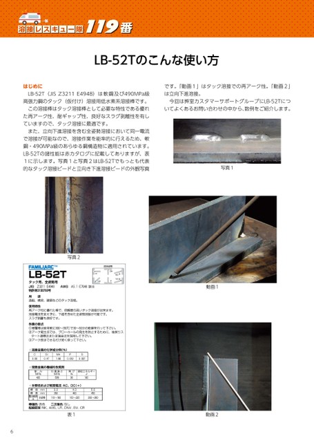 119番溶接レスキュー隊119番LB-52Tのこんな使い方はじめにLB-52T(JISZ3211E4948)は軟鋼及び490MPa級高張力鋼のタック(仮付け)溶接用低水素系溶接棒です。この溶接棒はタック溶接棒として必要な特性である優れた再アーク性、耐ギャップ性、良好なスラグ剥離性を有していますので、タック溶接に最適です。また、立向下進溶接を含む全姿勢溶接において同一電流で溶接が可能なので、溶接作業を能率的に行えるため、軟鋼・490MPa級のあらゆる鋼構造物に適用されています。LB-52Tの諸性能は赤カタログに記載してありますが、表1に示します。写真1と写真2はLB-52Tでもっとも代表的なタック溶接ビードと立向き下進溶接ビードの外観写真写真2です。「動画1」はタック溶接での再アーク性。「動画2」は立向下進溶接。今回は弊室カスタマーサポートグループにLB-52Tについてよくあるお問い合わせの中から、数例をご紹介します。写真1動画1表1動画26