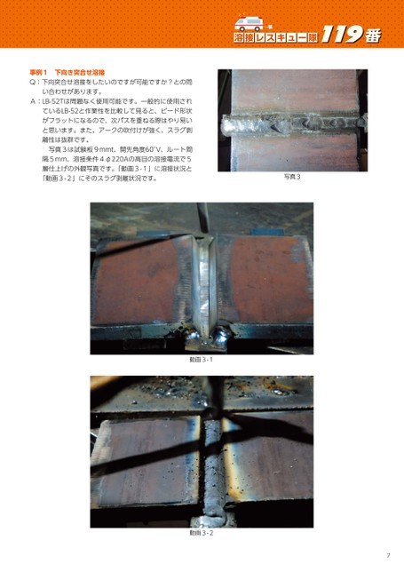 事例1下向き突合せ溶接Q:下向突合せ溶接をしたいのですが可能ですか?との問い合わせがあります。A:LB-52Tは問題なく使用可能です。一般的に使用されているLB-52と作業性を比較して見ると、ビード形状がフラットになるので、次パスを重ねる際はやり易いと思います。また、アークの吹付けが強く、スラグ剥離性は抜群です。写真3は試験板9mmt、開先角度60°V、ルート間隔5mm、溶接条件4φ220Aの高目の溶接電流で5層仕上げの外観写真です。「動画3-1」に溶接状況と「動画3-2」にそのスラグ剥離状況です。溶接レスキュー隊119番写真3動画3-1動画3-27