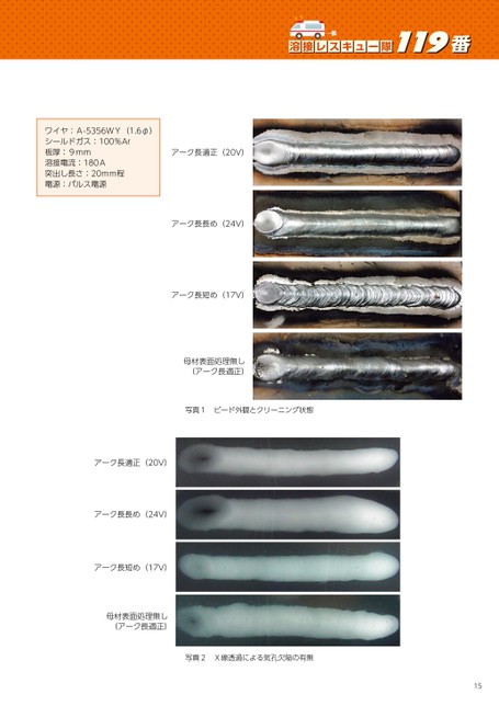 溶接レスキュー隊119番ワイヤ:A-5356WY(1.6φ)シールドガス:100%Ar板厚:9mm溶接電流:180A突出し長さ:20mm程電源:パルス電源アーク長適正(20V)アーク長長め(24V)アーク長短め(17V)母材表面処理無し(アーク長適正)写真1ビード外観とクリーニング状態アーク長適正(20V)アーク長長め(24V)アーク長短め(17V)母材表面処理無し(アーク長適正)写真2X線透過による気孔欠陥の有無15