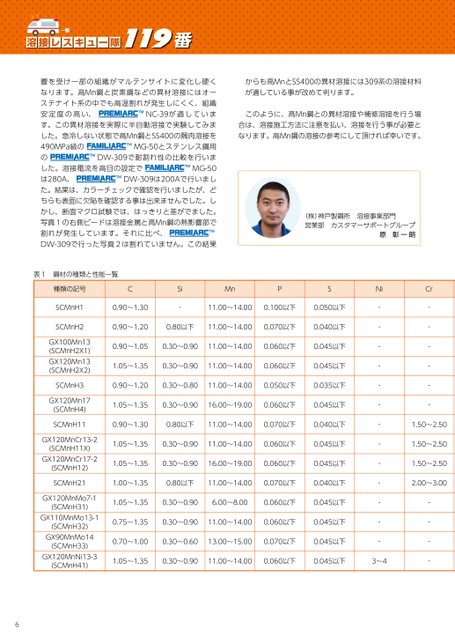 119番溶接レスキュー隊119番響を受け一部の組織がマルテンサイトに変化し硬くなります。高Mn鋼と炭素鋼などの異材溶接にはオーステナイト系の中でも高温割れが発生しにくく、組織安定度の高い、NC-39が適しています。この異材溶接を実際に半自動溶接で実験してみました。急冷しない状態で高Mn鋼とSS400の隅肉溶接を490MPa級のMG-50とステンレス鋼用のDW-309で耐割れ性の比較を行いました。溶接電流を高目の設定でMG-50は280A、DW-309は200Aで行いました。結果は、カラーチェックで確認を行いましたが、どちらも表面に欠陥を確認する事は出来ませんでした。しかし、断面マクロ試験では、はっきりと差がでました。写真1の右側ビードは溶接金属と高Mn鋼の熱影響部で割れが発生しています。それに比べ、DW-309で行った写真2は割れていません。この結果からも高MnとSS400の異材溶接には309系の溶接材料が適している事が改めて判ります。このように、高Mn鋼との異材溶接や補修溶接を行う場合は、溶接施工方法に注意を払い、溶接を行う事が必要となります。高Mn鋼の溶接の参考にして頂ければ幸いです。(株)神戸製鋼所溶接事業部門営業部カスタマーサポートグループ原彰 一 朗表1鋼材の種類と性能一覧種類の記号SCMnH1SCMnH2GX100Mn13(SCMnH2X1)GX120Mn13(SCMnH2X2)C0.90~1.30Si‐MnPS11.00~14.000.100以下0.050以下0.90~1.200.80以下11.00~14.000.070以下0.040以下0.90~1.050.30~0.9011.00~14.000.060以下0.045以下1.05~1.350.30~0.9011.00~14.000.060以下0.045以下SCMnH30.90~1.200.30~0.8011.00~14.000.050以下0.035以下GX120Mn17(SCMnH4)1.05~1.350.30~0.9016.00~19.000.060以下0.045以下SCMnH110.90~1.300.80以下11.00~14.000.070以下0.040以下GX120MnCr13-2(SCMnH11X)GX120MnCr17-2(SCMnH12)1.05~1.350.30~0.9011.00~14.000.060以下0.045以下1.05~1.350.30~0.9016.00~19.000.060以下0.045以下SCMnH211.00~1.350.80以下11.00~14.000.070以下0.040以下1.05~1.350.30~0.906.00~8.000.060以下0.045以下0.75~1.350.30~0.9011.00~14.000.060以下0.045以下0.70~1.000.30~0.6013.00~15.000.070以下0.045以下1.05~1.350.30~0.9011.00~14.000.060以下0.045以下3~4Ni‐‐‐‐‐‐‐‐‐‐‐‐‐Cr‐‐‐‐‐‐1.50~2.501.50~2.501.50~2.502.00~3.00‐‐‐‐GX120MnMo7-1(SCMnH31)GX110MnMo13-1(SCMnH32)GX90MnMo14(SCMnH33)GX120MnNi13-3(SCMnH41)6