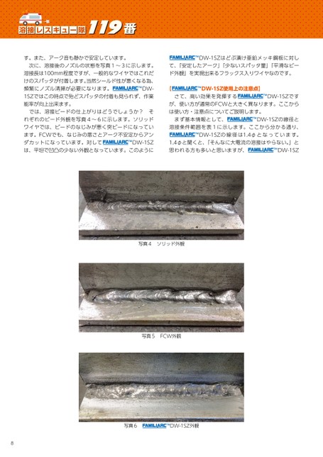 119番溶接レスキュー隊119番す。また、アーク音も静かで安定しています。次に、溶接後のノズルの状態を写真1~3に示します。溶接長は100mm程度ですが、一般的なワイヤではこれだけのスパッタが付着します。当然シールド性が悪くなる為、頻繁にノズル清掃が必要になります。DW-1SZではこの時点で殆どスパッタの付着も見られず、作業能率が向上出来ます。では、溶接ビードの仕上がりはどうでしょうか?それぞれのビード外観を写真4~6に示します。ソリッドワイヤでは、ビードのなじみが悪く突ビードになっています。FCWでも、なじみの悪さとアーク不安定からアンダカットになっています。対してDW-1SZは、平坦で凹凸の少ない外観となっています。このようにDW-1SZはどぶ漬け亜鉛メッキ鋼板に対して、「安定したアーク」「少ないスパッタ量」「平滑なビード外観」を実現出来るフラックス入りワイヤなのです。【DW-1SZ使用上の注意点】さて、高い効果を発揮するDW-1SZですが、使い方が通常のFCWと大きく異なります。ここからは使い方・注意点についてご説明します。まず基本情報として、溶接条件範囲を表1に示します。ここから分かる通り、DW-1SZの線径は1.4φとなっています。DW-1SZの線径と1.4φと聞くと、「そんなに大電流の溶接はやらない。」と思われる方も多いと思いますが、DW-1SZ写真4ソリッド外観写真5FCW外観8写真6DW-1SZ外観