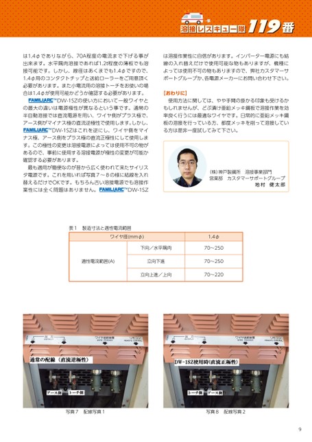 は1.4φでありながら、70A程度の電流まで下げる事が出来ます。水平隅肉溶接であれば1.2t程度の薄板でも溶接可能です。しかし、線径はあくまでも1.4φですので、1.4φ用のコンタクトチップと送給ローラーをご用意頂く必要があります。また小電流用の溶接トーチをお使いの場合は1.4φが使用可能かどうか確認する必要があります。DW-1SZの使い方において一般ワイヤとの最大の違いは電源極性が異なるという事です。通常の半自動溶接では直流電源を用い、ワイヤ側がプラス極で、アース側がマイナス極の直流逆極性で使用します。しかし、DW-1SZはこれを逆にし、ワイヤ側をマイナス極、アース側をプラス極の直流正極性にして使用します。この極性の変更は溶接電源によっては使用不可の物があるので、事前に使用する溶接電源が極性の変更が可能か確認する必要があります。最も適用が簡便なのが昔から広く使われて来たサイリスタ電源です。これを用いれば写真7~8の様に結線を入れ替えるだけでOKです。もちろん古い溶接電源でも溶接作業性には全く問題はありません。DW-1SZ溶接レスキュー隊119番は溶接作業性に自信があります。インバーター電源にも結線の入れ替えだけで使用可能な物もありますが、機種によっては使用不可の物もありますので、弊社カスタマーサポートグループか、各電源メーカーにお問い合わせ下さい。【おわりに】使用方法に関しては、やや手間の掛かる印象も受けるかもしれませんが、どぶ漬け亜鉛メッキ鋼板で溶接作業を効率良く行うには最適なワイヤです。日常的に亜鉛メッキ鋼板の溶接を行っている方、都度メッキを削って溶接している方は是非一度試してみて下さい。(株)神戸製鋼所溶接事業部門営業部カスタマーサポートグループ地村健太郎表1製造寸法と適性電流範囲ワイヤ径(mmφ)下向/水平隅肉適性電流範囲(A)立向下進立向上進/上向1.4φ70~25070~25070~220写真7配線写真1写真8配線写真29