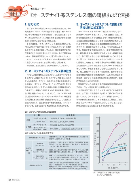 ●解説コーナー『オーステナイト系ステンレス鋼の鋼板および溶接1.はじめに当グループへの電話やメールでの技術相談には、中・高炭素鋼やステンレス鋼に関する溶材選定・施工法のお問い合わせが数多く寄せられます。その内容は様々ですが、先日頂いたステンレス鋼に関するお問い合わせが興味深い内容でしたのでご紹介致します。その内容は、「時々、ステンレス鋼の仕事が入り、PREMIARCTMDW-308(フラックス入りワイヤ)を使用してステンレス鋼を溶接しているが、溶接金属部が磁石に反応することがあると聞いたことがある。それで問題はないのか、詳細を教示頂きたい。」と言う問い合わせでした。確かに、オーステナイト系ステンレス鋼は非磁性(磁石に反応しない)であることは周知の通りと思います。では何故、磁石に反応したのかを説明していきます。2.オーステナイト系ステンレス鋼の磁性ステンレス鋼の種類は、①Cr系ステンレス鋼のマルテンサイト系ステンレス鋼とフェライト系ステンレス鋼、②Cr-Ni系ステンレス鋼のオーステナイト系ステンレス鋼と二相系ステンレス鋼(オーステナイト50%+フェライト50%組成)等に大別されます(表1に、ステンレス鋼の分類と代表鋼種を示す)。Cr系ステンレス鋼や二相系ステンレス鋼は炭素鋼と同様に、強い磁性を持っています。これに対して、18%Cr-8%Ni鋼(SUS304)で代表されるオーステナイト系ステンレス鋼(固溶化熱処理を施された鋼板)は磁性がありません。この性質(非磁性)を利用して、変圧器の容器や船舶の操舵室、マグネットクランプ等、磁性を遮する構造物等に多用されています。3.オーステナイト系ステンレス鋼および溶接材料の加工硬化オーステナイト系ステンレス鋼は図1に示すように、炭素鋼やフェライト系ステンレス鋼と比較すると、冷間での塑性加工によって硬化しやすい特性があります。この加工硬化の機構については十分に解明されていないようですが、常温における組織は常に安定したオーステナイト組織を示すかといえば、そうではないようです。常温以下まで過冷させたり、常温で塑性加工(曲げ・絞り等)を施すと容易にマルテンサイト組織を誘起して、加工硬化するとともに磁性を持つようになります。図2は、非磁性のオーステナイト系ステンレス鋼に塑性加工を施すと、Ni含有量の少ない鋼種は塑性加工の度合いによって加工誘起マルテンサイトの生成が著しくなり、導磁率も増加して行くことを示しています。加工誘起マルテンサイトの抑制は、鋼材の場合Niの含有量の増加が最も効果があり、SUS304(A)より安定なオーステナイト組成のSUS316(B)の使用が、効果的であることがわかります。塑性加工により加工硬化する現象は溶接材料も同様であり、ワイヤを例に取り説明致します。まずは成形工程にてフラックス入りワイヤの原型を作り、次工程にて製品径(1.2φ等)まで細く伸ばして製品にします。ワイヤを細くしていく段階において、ワイヤが伸ばされる際にワイヤ表面が加工硬化し、加工誘起マルテンサイトを生成します。このことにより、鋼板と同様に磁石に反応するようになります。8-81101-61Cr銅-3炭素銅010203040加工度(%)4504003503002502001500プリネルかたさ表1ステンレス鋼の分類と代表鋼種分類代表鋼種マルテンサイト系SUS403,SUS410,SUS420J1等フェライト系SUS405,SUS430,SUS444等オーステナイト系SUS304,SUS316,SUS317等オーステナイト・フェライト系(二相系)SUS329J1L,SUS329J2L,SUS329J3L等Cr系Cr-Ni系表2主なフェライト量の測定方法顕微鏡組織による方法溶着金属のフェライト占積率を顕微鏡組織により測定する方法で、占積率=フェライト量。被膜計法(マグネゲージ)永久磁石と、測定しようとする試片との間の磁性による吸引力が、フェライト量に対応して変化することを利用してフェライト量を測定する方法。磁気誘導法(フェライトスコープ)測定しようとする試片に含まれているフェライトにより、磁気誘導が減衰することを利用してフェライト量を測定する方法。磁気的な装置による方法磁力対比法(フェライトインジケータ)標準フェライト量に対応した磁性をもつインサートと、測定しようとする試片との間の吸引力を対比させ、フェライト量を測定する方法。JISZ3119-2006では規定より外れる。組織図による方法測定しようとする試片の化学成分からNi当量、Cr当量を算出して、組織図からフェライト量を推定する方法。組織図には、シェフラーの組織図、ディロンの組織図及びWRC-1992の組織図がJISZ3119-2006で規定されている。252016Winter図1冷間加工による硬化性の比較〔ステンレス鋼便覧〕