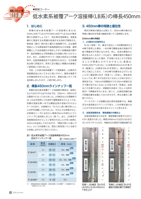 ●解説コーナー低水素系被覆アーク溶接棒(LB系)の棒長450mm1.はじめに神鋼の低水素系被覆アーク溶接棒と言えば、FAMILIARCTMLB-47やFAMILIARCTMLB-52Uが聞き慣れた銘柄でしょうか?低水素系溶接棒は、溶接金属中に残留する水素量を低減させる目的で開発され、耐低温(遅れ)割れ性に優れた溶接棒です。主な適用用途としては厚板部材や高強度部材などの溶接、適用鋼種としては低温割れが発生しやすい各種高張力鋼や中・高炭素鋼および特殊鋼などの溶接に用いられています。また、JIS検定やボイラー溶接士免許などの受験時や、全国溶接競技会でも使用されるなど、その信頼性は高く評価され、長年に亘り幅広い業種のお客様にご使用頂いて参りました。今回、この低水素系被覆アーク溶接棒を、JIS検定や溶接競技会においてさらに使いやすく、通常の業務でも作業効率をさらに向上させた、棒長の長いタイプを追加致しましたので、ご紹介致します。2.棒長450mmラインナップ一覧神鋼の低水素系被覆アーク溶接棒の棒長は、銘柄にもよりますが3.2φや4.0φでは、350mm・400mmが主要銘寸となっておりました。JIS検定などの受験時では、4.0φを使用しても条件や運棒速度などによっては、初層の溶接を棒一本では鋼板全長の溶接が行えないケースもあり、お客様から「もう少し長い棒が欲しい」との声を頂戴しておりました。そのような背景のもと、お客様のニーズにお応えし棒長450mmを新たにラインナップに追加致しました(表1)。主に、JIS検定や溶接競技会向けとしてご使用されることが多い銘柄に450mmを追加しておりますが、「棒長が長いと扱いづらい」というお客様には、現在ご使用頂いている銘寸も存続しますのでご安心ください。3.450mm棒の特徴と優位性現状の棒長の製品と比較して、450mm棒の最大の特徴と優位性を写真や動画を用いてご説明致します。【450mm棒の特徴】Ⅰ.JIS検定の合格率向上N-2V<板厚:9t、裏当て金なし>の初層溶接を3.2Φ棒で使用した場合、一本の棒で鋼板全長の溶接が可能で棒継ぎが不要となります。但し、従来の棒長だと棒が足らなくなるケースもあり、棒継ぎ箇所が裏曲げ試験範囲内となった場合、不合格になるリスクが高まることが課題とされておりました。動画は、FAMILIARCTMLB-52U:3.2Φ棒長450mmの作業です(動画①)。JIS検定のN-2Vを想定し、表2の溶接条件にて施工しており、1本の棒で初層を仕上げていることがご確認頂けます(写真1)。(※但し、開先条件によっては、棒1本では足りなくなることがあります。)通常品では、150mmの試験板のうち120mm程度の辺りで棒が足りなくなることがあります(写真2)。従来はこれを補うために、試験板中央部分(もしくは前半部分)で棒継ぎを行います。図1に、JIS検定試験の曲げ試験位置を記載しておりますので、停止位置をご確認ください。アークスタートが困難な低水素系溶接棒では、棒継ぎは大変高度なテクニックであり、この作業を避けることができるのは大変大きなメリットと言えます。Ⅱ.全国溶接競技会薄板課題の外観向上全国溶接競技会では近年、薄板課題の板厚が3.2tから4.5tへ変更されました。棒長が400mmでは足りるか足りないかギリギリとなり、外観劣化の原因や溶着金属不足写真1JIS検定【N-2V】LB-52U(3.2Φ-450mm)1本仕上げ写真2JIS検定【N-2V】裏曲げ試験位置での棒継ぎ裏曲げ位置表曲げ位置裏曲げ位置表曲げ位置表1低水素系被覆アーク溶接棒棒長450mm追加ラインナップ一覧F:FAMILIARCTM銘柄棒径(mm)先端加工棒長(mm)FLB-47FLB-52UFLB-52FLB-52B※13.24.03.24.03.24.04.0無・有無・有New!New!350、450400、450無・有350、400、450New!無・有無・有無・有無・有New!New!New!400、450350、450400、450450※1鋼鉄道橋溶接工技量試験(JR認定試験)向け被覆アーク溶接棒のため1銘柄のみとなります。252016Summer