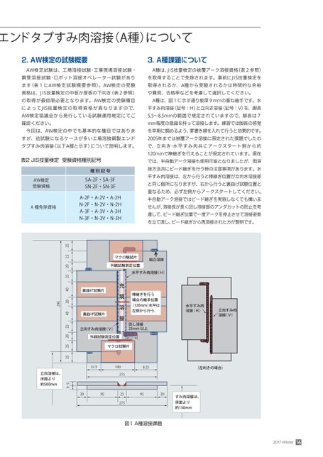 2017Winter16水平すみ肉溶接(H)立向すみ肉溶接(V)マクロ験試片外観試験測定位置組立溶接水平すみ肉溶接(H)棒継ぎを行う場合の継手位置(120mm)水平は左側から行う。回し溶接25mm以上充填溶接裏曲げ試験片裏曲げ試験片立向すみ肉溶接(V)外観試験測定位置マクロ試験片2525202540204025202525290立向溶接は、床面より約500mm9932.53095100215252758.25(左利きの場合)9530すみ肉溶接は、床面より約150mm図1A種溶接課題エンドタブすみ肉溶接(A種)について2.AW検定の試験概要3.A種課題についてAW検定試験は、工場溶接試験・工事現場溶接試験・鋼管溶接試験・ロボット溶接オペレーター試験があります(表1にAW検定試験概要参照)。AW検定の受験資格は、JIS技量検定の中板か厚板の下向き(表2参照)の取得が最低限必要となります。AW検定の受験種目によってJIS技量検定の取得資格が異なりますので、AW検定協議会から発行している試験運用規定にてご確認ください。今回は、AW検定の中でも基本的な種目ではありますが、追試験になるケースが多い工場溶接鋼製エンドタブすみ肉溶接(以下A種と示す)について説明します。表2JIS技量検定受験資格種別記号AW検定受験資格A種免除資格種別記号SA-2F・SA-3FSN-2F・SN-3FA-2F・A-2V・A-2HN-2F・N-2V・N-2HA-3F・A-3V・A-3HN-3F・N-3V・N-3HA種は、JIS技量検定の被覆アーク溶接資格(表2参照)を取得することで免除されます。事前にJIS技量検定を取得されるか、A種から受験されるかは時間的な余裕や費用、合格率などを考慮して選択してください。A種は、図1に示す通り板厚9mmの重ね継手です。水平すみ肉溶接(記号:H)と立向き溶接(記号:V)を、脚長5.5〜8.5mmの範囲で規定されていますので、脚長は7mm程度の意識を持って溶接します。練習では脚長の感覚を早期に掴めるよう、罫書き線を入れて行うと効果的です。2005年までは被覆アーク溶接に限定された課題でしたので、立向き・水平すみ肉共にアークスタート側から約120mmで棒継ぎを行えることが規定されています。現在では、半自動アーク溶接も使用可能となりましたが、両溶接方法共にビード継ぎを行う時の注意事項があります。水平すみ肉溶接は、左から行うと棒継ぎ位置が立向き溶接部と同じ個所になりますが、右から行うと裏曲げ試験位置と重なるため、必ず左側からアークスタートしてください。半自動アーク溶接ではビード継ぎを実施しなくても構いませんが、溶接長が長く回し溶接部のアンダカットの防止を考慮して、ビード継ぎ位置で一度アークを停止させて溶接姿勢を立て直し、ビード継ぎから再溶接された方が賢明です。