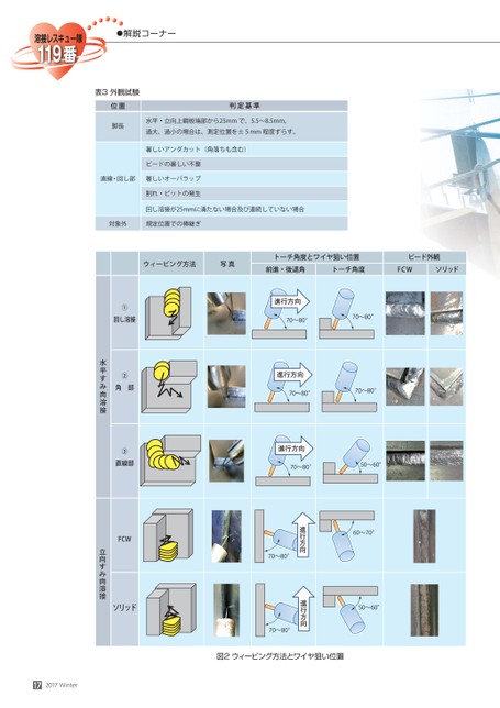 ●解説コーナー表3外観試験位置脚長判定基準水平・立向上鋼板端部から25mmで、5.5〜8.5mm。過大、過小の場合は、測定位置を±5mm程度ずらす。著しいアンダカット(角落ちも含む)ビードの著しい不整直線・回し部著しいオーバラップ割れ・ピットの発生回し溶接が25mmに満たない場合及び連続していない場合対象外規定位置での棒継ぎウィービング方法写真トーチ角度とワイヤ狙い位置ビード外観前進・後退角トーチ角度FCWソリッド進行方向70〜80°70〜80°進行方向70〜80°70〜80°進行方向70〜80°50〜60°60〜70°50〜60°進行方向進行方向70〜80°70〜80°①回し溶接②角部③直線部FCWソリッド水平すみ肉溶接172017Winter図2ウィービング方法とワイヤ狙い位置