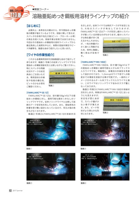 ●解説コーナー溶融亜鉛めっき鋼板用溶材ラインナップの紹介【はじめに】品質向上・長寿命化の観点から、昨今亜鉛めっき鋼板の需要が増えているようです。溶接に関して言えば、スパッタの多発や気孔欠陥(ピット・ブローホール等)の発生を招くため、溶接作業は容易ではありません。今回はその亜鉛めっき鋼板用の溶材ラインナップから最近発売した銘柄を中心に、実際の溶接作業性やビード外観等を、動画も含めて紹介したいと思います。【ワイヤの作業性紹介】これから各種専用溶材を溶接動画も含めて紹介して参りますが、動画①・写真①の従来ソリッドワイヤでの亜鉛めっき鋼板溶接状況と比較しながらご覧ください。特にスパッタの飛散状況やアークの安定具合にご注目いただき、専用溶材の作業性や性能の優位性、ピットの少なさ等をご確認ください。写真①[FAMILIARCTMSE-1Z]FAMILIARCTMSE-1Zは、目付量100g/㎡以下の亜鉛めっき鋼板に対し、適用可能な銅めっきなしのソリッドワイヤです。従来ソリッドワイヤと比較して抜群のアーク安定性を有しています。また、亜鉛蒸気の影響を受け難い設計になっているので、気孔欠陥の発生も少なくなります。動画②・写真②にFAMILIARCTMSE-1Zの溶接状況を示します。従来ワイヤでは時折アークが不安定になり、大粒のスパッタが発生しておりますが、FAMILIARCTMSE-1Zはアークが安定し細かいスパッタが散っている状態なのがわかります。細かいスパッタは発生量が多く見えるかもしれませんが、一粒の熱量が小さく遠くに飛散するため、母材に融着し難く除去が容易です。写真②[FAMILIARCTMMX-100Z]FAMILIARCTMMX-100Zは、目付量150g/㎡以下の亜鉛めっき鋼板に適用可能なメタル系フラックス入りワイヤです。薄板用に、低電流の作業性を考慮して設計されており、1.2mmφのワイヤ径で1.2t程度までの薄板を溶接する事が可能です。一般的にイメージされるルチール系フラックス入りワイヤと違い、このワイヤはソリッドワイヤ並みのスラグ量になっております。動画③・写真③にFAMILIARCTMMX-100Zの溶接状況を示します。特徴はFAMILIARCTMSE-1Zに近いようにも見えますが、安定性が更に良好で、スパッタ量が少ない様子が窺えます。また、ビード形状がより滑らかな形状になります。写真③動画①動画③動画②動画④252017Summer