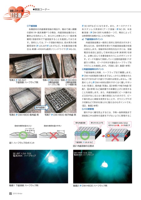 ●解説コーナー③下盛溶接各種部材の肉盛補修溶接の場合や、極めて硬い鋼種の部材(中・高炭素鋼※1)の場合、肉盛溶接金属のはく離防止を目的として、あらかじめ軟らかい(一般炭素鋼用)溶接材料で下盛溶接することを推奨しております。溶材としては、アーク溶接の場合は、低水素系の軟鋼用溶材(LB-26やLB-47など)、半自動溶接の場合は、軟鋼〜490MPa級用ソリッドワイヤ(MG-50、写真3SE-50T下盛溶接ハーフラップ例写真4DW-H6003層肉盛溶接ハーフラップ例写真5DW-H8002層肉盛溶接ビード横割れ例筋肉盛後に写真6DW-H800筋肉盛例写真7DW-H800格子肉盛例SE-50Tなど)になります。また、オーステナイト系ステンレス用溶材(アーク溶接:NC-39、半自動溶接:DW-309)も候補の一つで、場合によっては熱管理を省略することも可能です。a)下盛溶接のポイント肉盛溶接金属は一般的に母材と溶材成分が大きく異なるため、母材希釈を受けて肉盛溶接金属の性能は変化します。溶接材料の特性を生かすには、溶接電流を低目に設定して母材溶込み率(希釈率)を抑え、必要に応じて多層溶接を行うことがポイントです。ビードを重ねて溶接していく全面肉盛溶接(ベタ盛り)の際は、ビードの半分を重ねるハーフラップ法で行うことを推奨します。(写真3、図1、動画1参照)④肉盛溶接時のポイント下盛溶接時と同様、ハーフラップ法で積層します。DW-H600程度の硬さまではしっかりと管理された施工ができればベタ盛りでも割れは発生しません。(写真4)しかしDW-H800は割れやすくはく離しやすいため(写真5)、筋肉盛(写真6、図3参照)や格子肉盛(写真7、図4参照)など最終層での単層仕上げに使用することを推奨します。また、肉盛溶接部にビード垂れなど凸凹が生じるとはく離の原因になりますので、ビード垂れ防止に銅板を使用することや、ガウジングやガス切断などで形状を滑らかに整えるのもポイントです。(図2、動画2参照)⑤パス間管理割れやはく離を防止するには、予熱〜後熱実施まで溶接施工中は部材の温度を下げないように管理するこ母材の希釈を受けにくい母材の希釈を受けやすいハーフラップ硬化肉盛溶接滑らかに仕上げるビード端部が凸凹になると切欠からはく離、かけを起こす図1ハーフラップのポイント下盛溶接(LB-26など)図2肉盛溶接の注意点動画1下盛溶接ハーフラップ例動画2DW-H600ハーフラップ例172018Winter