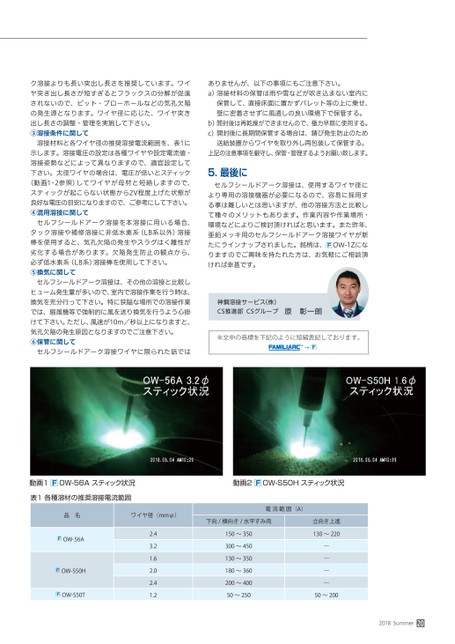 ク溶接よりも長い突出し長さを推奨しています。ワイヤ突き出し長さが短すぎるとフラックスの分解が促進されないので、ピット・ブローホールなどの気孔欠陥の発生源となります。ワイヤ径に応じた、ワイヤ突き出し長さの調整・管理を実施して下さい。③溶接条件に関して溶接材料と各ワイヤ径の推奨溶接電流範囲を、表1に示します。溶接電圧の設定は各種ワイヤや設定電流値・溶接姿勢などによって異なりますので、適宜設定して下さい。太径ワイヤの場合は、電圧が低いとスティック(動画1・2参照)してワイヤが母材と短絡しますので、スティックが起こらない状態から2V程度上げた状態が良好な電圧の目安になりますので、ご参考にして下さい。④混用溶接に関してセルフシールドアーク溶接を本溶接に用いる場合、タック溶接や補修溶接に非低水素系(LB系以外)溶接棒を使用すると、気孔欠陥の発生やスラグはく離性が劣化する場合があります。欠陥発生防止の観点から、必ず低水素系(LB系)溶接棒を使用して下さい。⑤換気に関してセルフシールドアーク溶接は、その他の溶接と比較しヒューム発生量が多いので、室内で溶接作業を行う時は、換気を充分行って下さい。特に狭隘な場所での溶接作業では、扇風機等で強制的に風を送り換気を行うよう心掛けて下さい。ただし、風速が10m/秒以上になりますと、気孔欠陥の発生原因となりますのでご注意下さい。⑥保管に関してセルフシールドアーク溶接ワイヤに限られた話ではありませんが、以下の事項にもご注意下さい。a)溶接材料の保管は雨や雪などが吹き込まない室内に保管して、直接床面に置かずパレット等の上に乗せ、壁に密着させずに風通しの良い環境下で保管する。b)開封後は再乾燥ができませんので、極力早期に使用する。c)開封後に長期間保管する場合は、錆び発生防止のため送給装置からワイヤを取り外し再包装して保管する。上記の注意事項を厳守し、保管・管理するようお願い致します。5.最後にセルフシールドアーク溶接は、使用するワイヤ径により専用の溶接機器が必要になるので、容易に採用する事は難しいとは思いますが、他の溶接方法と比較して種々のメリットもあります。作業内容や作業場所・環境などによりご検討頂ければと思います。また昨年、亜鉛メッキ用のセルフシールドアーク溶接ワイヤが新たにラインナップされました。銘柄は、OW-1Zになりますのでご興味を持たれた方は、お気軽にご相談頂ければ幸甚です。神鋼溶接サービス(株)CS推進部CSグループ原彰一朗※文中の商標を下記のように短縮表記しております。動画1OW-56Aスティック状況表1各種溶材の推奨溶接電流範囲動画2OW-S50Hスティック状況品名ワイヤ径(mmφ)電流範囲(A)下向/横向き/水平すみ肉OW-56AOW-S50HOW-S50T2.43.21.62.02.41.2150〜350300〜450130〜350180〜360200〜40050〜250立向き上進130〜220――――50〜2002018Summer20