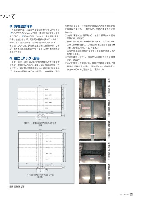 ついて3.使用溶接材料この試験では、全姿勢で使用可能なソリッドワイヤ「SE-50T1.2mmφ」と立向上進が得意なフラックス入りワイヤ「DW-100V1.2mmφ」を推奨します。詳細は後述しますが、それぞれ特長が異なりますので、姿勢ごとに使い分けされるのも良いかと思います。ワイヤ径については、試験規定上は特に制限がないですが、板厚と指定脚長範囲からすると1.2mmφが最適かと思われます。4.組立(タック)溶接まず、前述(図2)のとおり寸法精度がとても重要ですので、罫書きなどを行い慎重に組立溶接を実施してください。組立時の溶接個所は特に規定はありませんが、本溶接の邪魔にならない箇所で、本溶接後も歪みや変更が少なく、寸法精度が維持される組立溶接でなければなりません。一例として、実際の手順を次に示します。①中央に裏当て金(板厚9㎜)、左右に板厚6㎜の板を配置する。(写真1)②裏当て金の中央に25㎜幅の板を置き、左右から挟むように試験板を置く。この際試験板の端部を板厚6㎜の板に載せるようにする。(写真2)この状態で組立溶接するとちょうど良い逆歪み(2程度)となる。③寸法を確認しながら、横面から両端部を軽く点溶接する。(写真3)④さらに裏面から溶接する。裏側の溶接時は裏曲げ試験片の採取位置を避け、両端部4点に15㎜程度のショートビードで溶接する。(写真4、5)写真1組立手順①写真2組立手順②写真3組立手順③写真4組立手順④写真5組立手順⑤約275単位mm3040150104030(呼び)9.0単位mm4040削除部裏曲げ試験片削除部裏曲げ試験片約275削除部裏曲げ試験片削除部約125下向溶接で充填する。(呼び)S9.0S2550SS約125被覆アーク溶接の試験材の形状および寸法(手棒)20040削除部4040(呼び)9.0裏曲げ試験片削除部約125下向溶接で充填する。(呼び)S9.0S2550SS約125マグ溶接の試験材の形状および寸法(半自動)図2試験体寸法2019Winter24