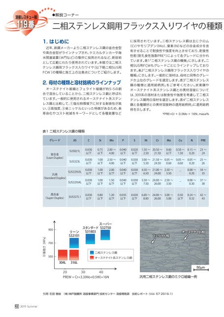 ●解説コーナー二相ステンレス鋼用フラックス入りワイヤの種類1.はじめに近年、鉄鋼メーカーより二相ステンレス鋼の省合金型や高合金型がラインナップされ、ケミカルタンカーや海水関連装置(水門など)の製作に採用されるなど、新技術として広範にわたり使用されています。本稿では二相ステンレス鋼用フラックス入りワイヤ(以下略二相SUS用FCW)の種類と施工上の注意点についてご紹介します。2.母材の種類と溶材銘柄のラインナップオーステナイト組織とフェライト組織が約5:5の割合で混合していることから、二相ステンレス鋼と呼ばれています。一般的に使用されるオーステナイト系ステンレス鋼と比較して、①塩化物環境下に対する耐食性が高い、②高強度、③省ニッケルといった特徴があるため、長寿命化やコスト削減をキーワードとして各種装置などに採用されています。二相ステンレス鋼は主にクロム(Cr)やモリブデン(Mo)、窒素(N)などの合金成分を含有させることで耐食性や強度を向上させており、耐食性性能(耐孔食性指数PRE*)によって各グレードに分かれています。表1「二相ステンレス鋼の種類」に示します。二相SUS用FCWもグレードごとにラインナップしております。表2「二相ステンレス鋼用フラックス入りワイヤの種類」に示します。一般的に溶材は、母材と同等のグレードか上位のグレードを選定します。表3「二相ステンレス鋼の種類と適用銘柄例」をご参考ください。炭素鋼やオーステナイト系ステンレス鋼との異材溶接については、309系の溶材または耐食性や強度を考慮して二相ステンレス鋼用の溶材を選定します。表4「二相ステンレス鋼と各種鋼材との異材溶接時の適用銘柄例」に適用銘柄例を示します。*PRE=Cr+3.3Mo+16N,mass%表1二相ステンレス鋼の種類グレードJISCSiMnPSNiCrMoCuNPRE省合金(LeanDuplex)汎用(StandardDuplex)SUS821LSUS323LSUS329J3LSUS329J4L0.030以下0.030以下0.030以下0.030以下0.75以下1.00以下1.00以下1.00以下2.00〜4.002.50〜4.002.00以下1.50以下0.040以下0.040以下0.040以下0.040以下0.020以下0.030以下0.030以下0.030以下1.50〜2.5020.50〜21.500.60以下0.50〜1.500.15〜0.203.00〜5.5021.50〜24.500.05〜0.600.05〜0.600.05〜0.204.50〜6.5021.00〜24.002.50〜3.505.50〜7.5024.00〜26.002.50〜3.50‒‒0.08〜0.200.08〜0.3023〜2425〜2634〜3537〜38高合金(SuperDuplex)SUS327L10.030以下0.80以下1.20以下0.035以下0.020以下6.00〜8.0024.00〜26.003.00〜5.000.50以下0.24〜0.3242〜43スーパーS32750スタンダードS31803リーンS32101フェライト相オーステナイト相二相ステンレス鋼オーステナイト系ステンレス鋼304L316L203040PREW=Cr+3.3(Mo+0.5W)+16N汎用二相ステンレス鋼のミクロ組織一例900700500引張強さ[MPa]引用:石田雅俊(株)神戸製鋼所溶接事業部門技術センター溶接開発部技術レポート(Vol.572016-1)232019Summer