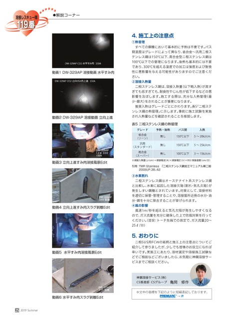 ●解説コーナー動画1DW-329AP溶接動画水平すみ肉動画2DW-329AP溶接動画立向上進動画3立向上進すみ肉溶接風景Edit動画4立向上進すみ肉スラグ剥離Edit動画5水平すみ肉溶接風景Edit動画6水平すみ肉スラグ剥離Edit252019Summer4.施工上の注意点①熱管理すべての鋼種において基本的に予熱は不要です。パス間温度はグレードによって異なり、省合金〜汎用二相ステンレス鋼は150℃以下、高合金型二相ステンレス鋼は100℃以下での管理になります。後熱も基本的には不要であり、300℃を超える温度での加工は強度および耐食性に悪影響を与える可能性がありますのでご注意ください。②溶接入熱量二相ステンレス鋼は、溶接入熱量(以下略入熱)が高すぎても低すぎても、耐食性やじん性が低下するなどの悪影響を及ぼします。施工する際は、充分な入熱管理(最少・最大)をされることが重要になります。推奨入熱はグレードごとにかわります。表5「二相ステンレス鋼の熱管理」に示します。事前に施工試験を実施され入熱量などを確認されることを推奨します。表5二相ステンレス鋼の熱管理グレード省合金(リーン)汎用(スタンダード)高合金(スーパー)予熱・後熱パス間入熱無し無し無し150℃以下5〜20kJ/cm150℃以下5〜25kJ/cm100℃以下3〜15kJ/cm※溶接入熱量(J/cm)=溶接電流(A)×溶接電圧(V)×60/溶接速度(cm/分)引用:TMRStainless「二相ステンレス鋼加工マニュアル第二版2009」P.38、42③水素割れ二相ステンレス鋼はオーステナイト系ステンレス鋼と比較し、水素に起因した溶接欠陥(割れ・気孔欠陥)が発生しすい鋼種とされています。対策として、溶接材料を適切に保管・管理することや、溶接箇所近傍の水分・油分・錆を十分に除去することが挙げられます。④風の影響風速1m/秒を超えると気孔欠陥が発生しやすくなるので、ガス流量を充分に確保した上で防風対策を行ってください。目安:トーチ先端での測定で、ガス流量20〜25ℓ/分)5.おわりに二相SUS用FCWの銘柄と施工上の注意点についてご紹介して参りましたが、少しでも皆様のお役立になれば幸いです。実施工にあたり、溶材選定や溶接施工試験などでご相談などございましたら、お気軽に神鋼溶接サービスまでご相談ください。神鋼溶接サービス(株)CS推進部CSグループ亀岡修作※文中の商標を下記のように短縮表記しております。