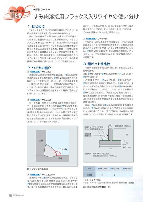 ●解説コーナーすみ肉溶接用フラックス入りワイヤの使い分け1.はじめに「フラックス入りワイヤの採用を検討しているが、銘柄が多すぎて何を使えば良いのかわからない。」我々がお客様からお問い合わせを受けている中で、このようなお話をいただくことがあります。フラックス入りワイヤ(以下FCW)は、そのフラックスの配合を調整することでソリッドワイヤ以上に多種多様な特性を持たせることができるため、軟鋼〜490MPa級用だけでも多くの種類がラインナップされています。今回は、その一部となりますが、お客様のお仕事に合わせてベストなFCWをお使いいただくために、すみ肉溶接用FCW4銘柄の使い分けについてご説明致します。2.ワイヤの紹介①MX-Z200神鋼のすみ肉溶接用FCWと言えば、MX-Z200が代表的なワイヤになります。MX-Z200の最大の特長は耐ピット性です(*注ピット…ビードの表面まで達し、開口した気孔欠陥)。一般的なFCWの中ではもっとも耐ピット性に優れ、造船や橋梁などで多用されるプライマ(一次防錆塗料)が塗布された鋼板の溶接などに用いられています。②MX-Z50Fビード外観・形状とスラグはく離性の向上を図り、アーク感にこだわって作られたのがMX-Z50Fです。水平すみ肉溶接でのビード形状がフラットでフランク角(図1参照)も大きいため、ビードの際のスラグまで取れやすくなっています。そのため、溶接後に塗装やめっき処理をされているお客様から「塗装後のトラブルが少ない」と評価されています。立板フランク角下板ねたビードの揃いが良く、仕上げ後にスラグを1度に除去することができ、ビード表面にスパッタが付着していない美麗なビード外観が得られます。④DW-50BF一般的なFCWの水平すみ肉溶接では、1パスでの最大脚長は7〜8mm程度が限界であり、それ以上を求めるとアンダカットやオーバラップを招きます。しかし、DW-50BFは最大で10mm程度の脚長を、アンダカットなどが生じることなく1パスで溶接することが可能です。3.耐ピット性比較4銘柄を耐ピット性の良い順に並べると次のとおりになります。(優)MX-Z200=MX-Z200MP>MX-Z50F>DW-50BF(劣)ご参考までに、MX-Z200・MX-Z50F・DW-50BFの3銘柄で比較したデータを表1に示します。このデータでは耐ピット性に劣るDW-50BFにピットが発生しています。しかし、もっとも優れるMX-Z200でも絶対に「発生しない」わけではなく、母材表面状態や溶接条件(電流・電圧・溶接速度など)次第ではピットが発生することもありますのでご注意ください。また、MX-Z50FはMX-Z200と比較すれば劣るものの、DW-Z100などのスラグ系ワイヤよりは耐ピット性に優れるため、「スラグ系のような平坦な外観が良いが、ピットで困っている」という方には有用です。無機ジンクプライマ塗布プライマ塗布膜厚30μm立板端面機械加工12試験板長さ:600mm851285単位:mm溶接条件:電流280A、電圧32V、溶接速度50cm/min、100%CO2図1フランク角概略図銘柄MX-Z200MX-Z50FDW-50BF③MX-Z200MP基本的な特性はMX-Z200と同じですが、こちらは多パスの水平すみ肉溶接用に改良されたFCWで、MX-Z200と比較しスラグの密着性を向上させています。多パスの積層途中でスラグがはく離しないため重発生数001*注1N=2の平均値*注2スタート・エンド各100mmをのぞく400mm間にて評価表1表面欠陥の発生数の一例232020Autumn