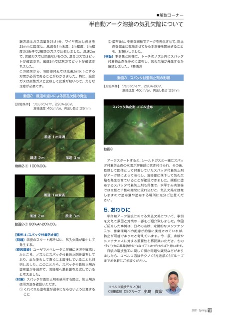 半自動アーク溶接の気孔欠陥について●解説コーナー験方法はガス流量を25ℓ/分、ワイヤ突出し長さを25mmに固定し、風速を1m未満、2m程度、3m程度の3条件で2種類のガスで比較しました。風速2mで、炭酸ガスでは問題ないものの、混合ガスではピットが確認され、風速3mでは双方でピットが確認されました。この結果から、溶接部付近では風速2m以下とする対策が必須であることがわかりました。特に、混合ガスは炭酸ガスと比較して比重が軽いので、充分な注意が必要です。動画2風速の違いによる気孔欠陥の発生【溶接条件】ソリッドワイヤ、230A-26V、溶接速度:40cm/分、突出し長さ:25mm②塗布後は、不要な鋼板でアークを発生させて、防止剤を完全に乾燥させてから本溶接を開始することを、お願いしました。(検証)本事象と同様に、トーチのノズル内にスパッタ付着防止剤を多めに塗布し、気孔欠陥が発生するか確認しました。(動画3)動画3スパッタ付着防止剤の影響【溶接条件】ソリッドワイヤ、230A-26V、溶接速度:40cm/分、突出し長さ:25mm動画2-①100%CO2動画2-②80%Ar-20%CO2【事例-4:スパッタ付着防止剤】(問題)溶接のスタート部そばに、気孔欠陥が集中して発生する。(原因調査)ユーザでオペレータに詳細に状況を確認したところ、ノズルにスパッタ付着防止剤を塗布しており、また塗布して直ぐに本溶接していることも判明しました。このことから、スパッタ付着防止剤の塗布量が多過ぎて、溶接部へ悪影響を及ぼしていると考えました。(対策)スパッタ付着防止剤を使用する際は、防止剤の使用方法を確認いただき、①くれぐれも塗布量が過多にならないよう注意すること動画3アークスタートすると、シールドガスと一緒にスパッタ付着防止剤の水滴が溶接部に吹き付けられ、その後、乾燥して固体として付着していたスパッタ付着防止剤がアーク熱によって液化し、溶接部に落下して気孔欠陥を発生させていることが確認できました。鋼板に塗布するスパッタ付着防止剤も同様で、水平すみ肉溶接では立板と下板の隙間に流れ込むと、気孔欠陥を誘発しますので塗布量や塗布する場所に充分ご注意ください。5.おわりに半自動アーク溶接における気孔欠陥について、事例を交えて原因と対策の一部をご紹介致しました。今回ご紹介した事例は、日々の点検、定期的なメンテナンスや、作業環境への配慮が的確に実施されていれば、防止が可能であったと考えています。今一度、点検やメンテナンスに対する重要性を再認識いただき、ものづくり力の基盤強化につなげていただければと思います。日頃の溶接施工に関して何か問題や疑問などがありましたら、コベルコ溶接テクノCS推進部CSグループまでお気軽にご相談ください。コベルコ溶接テクノ(株)CS推進部CSグループ小島貴宏2021Spring18