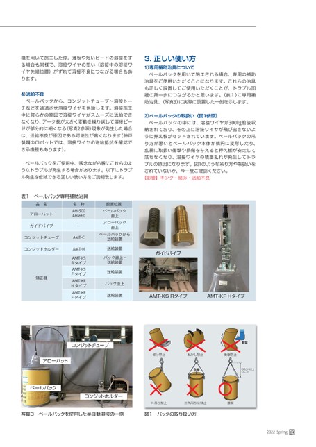 機を用いて施工した際、薄板や短いビードの溶接をする場合も同様で、溶接ワイヤの狙い(溶接中の溶接ワイヤ先端位置)がずれて溶接不良につながる場合もあります。4)送給不良ペールパックから、コンジットチューブ〜溶接トーチなどを通過させ溶接ワイヤを供給します。溶接施工中に何らかの原因で溶接ワイヤがスムーズに送給できなくなり、アーク長が大きく変動を繰り返して溶接ビードが部分的に細くなる(写真2参照)現象が発生した場合は、送給不良が原因である可能性が高くなります(神戸製鋼のロボットでは、溶接ワイヤの送給抵抗を確認できる機種もあります)。ペールパックをご使用中、残念ながら稀にこれらのようなトラブルが発生する場合があります。以下にトラブル発生を低減できる正しい使い方をご説明致します。3.正しい使い方1)専用補助治具についてペールパックを用いて施工される場合、専用の補助治具をご使用いただくことになります。これらの治具も正しく設置してご使用いただくことが、トラブル回避の第一歩につながるかと思います。(表1)に専用補助治具、(写真3)に実際に設置した一例を示します。2)ペールパックの取扱い(図1参照)ペールパックの中には、溶接ワイヤが300㎏前後収納されており、その上に溶接ワイヤが飛び出さないように押え板がセットされています。ペールパックの吊り方が悪いとペールパック本体が楕円に変形したり、乱暴に取扱い衝撃や損傷を与えると押え板が安定して落ちなくなり、溶接ワイヤの積層乱れが発生してトラブルの原因になります。図1のような吊り方や取扱いをされていないか、今一度ご確認ください。【影響】キンク・絡み・送給不良表1ペールパック専用補助治具品名アローハットガイドパイプ名称AH-500AH-660-コンジットチューブAMT-Cコンジットホルダー矯正機AMT-HAMT-KSRタイプAMT-KSFタイプAMT-KFHタイプAMT-KFFタイプ設置位置ペールパック直上アローパック直上ペールパックから送給装置送給装置パック直上・送給装置送給装置パック直上送給装置ガイドパイプAMT-KSRタイプAMT-KFHタイプコンジットチューブ衝撃傾け禁止転がし禁止衝撃禁止危険80cm以上のことアローハットペールパックコンジットホルダー片吊り禁止三角吊りは禁止推奨写真3ペールパックを使用した半自動溶接の一例図1パックの取り扱い方2022Spring16